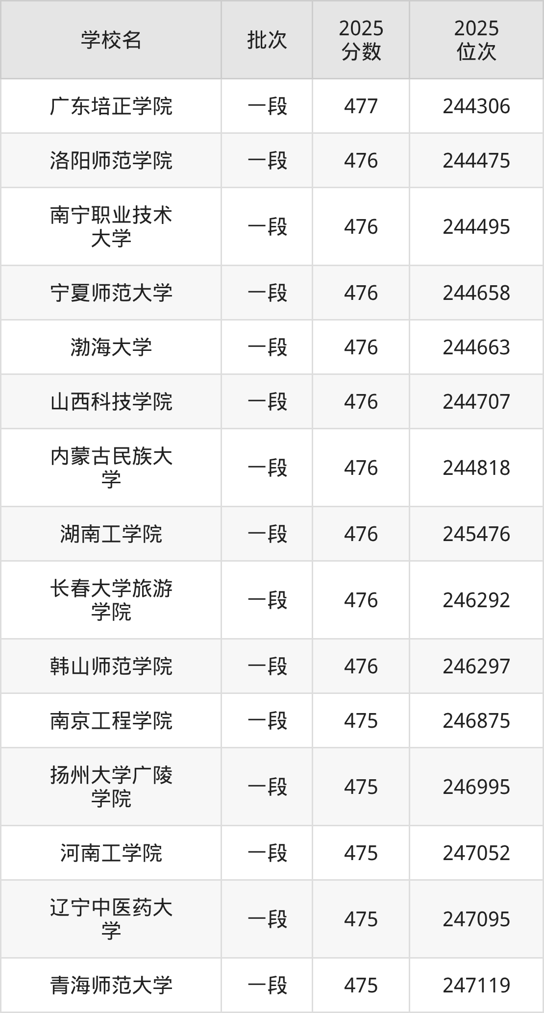 2025年山东高考476分(244346名~246783名)能上的大学有南宁职业技术大学、洛阳师范学院、山西科技学院、湖南工学院等。