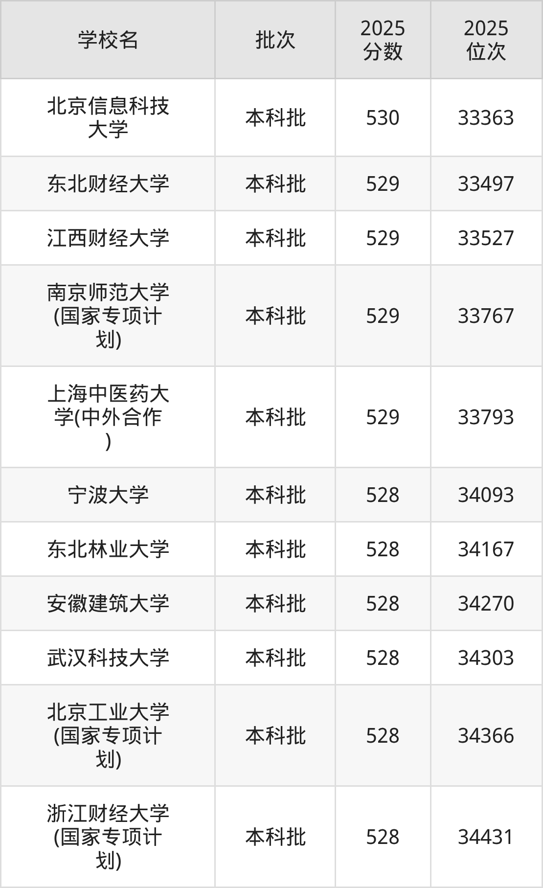 这些都是2026年高考物理类33495名~34047名考生可以报考的大学,更多学校名单如下表所示: