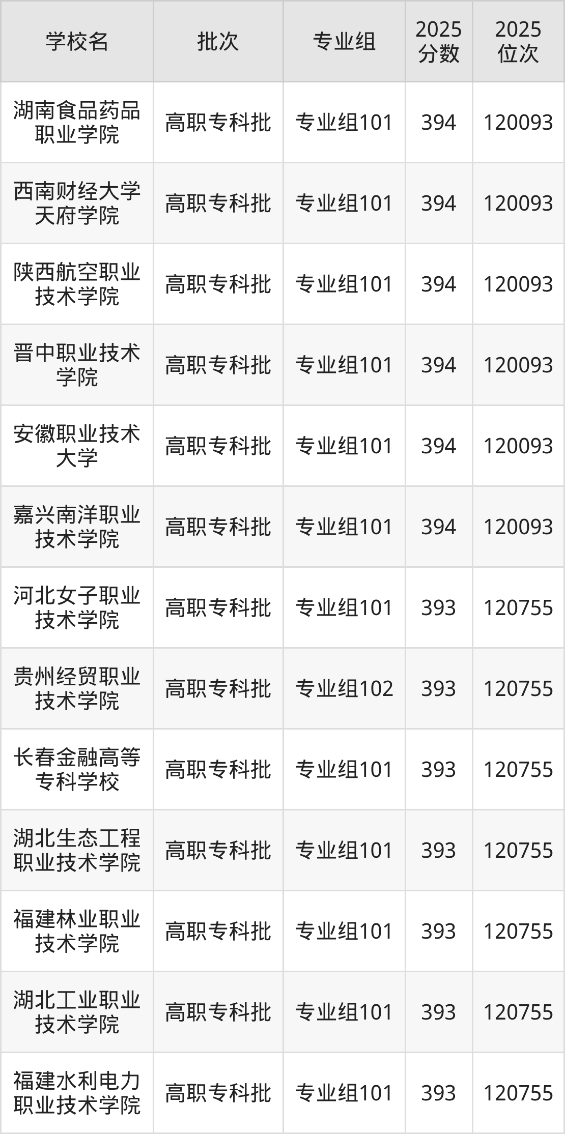 2025年四川高考历史类393分(120094名~120755名)能上的大学有福建水利电力职业技术学院专业组101、河北女子职业技术学院专业组101、湖北工业职业技术学院专业组101、福建林业职业技术学院专业组101等。