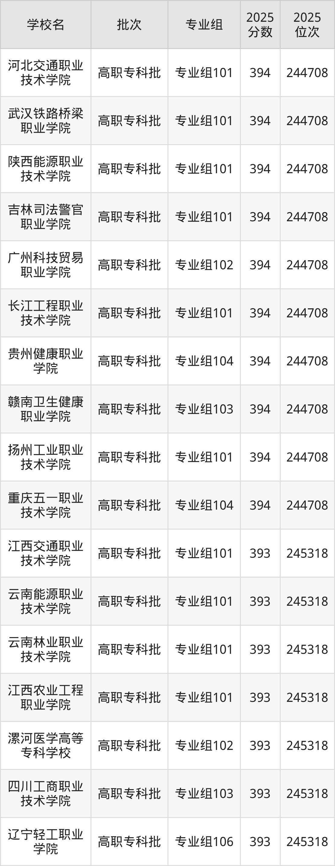 2025年四川高考物理类393分(244709名~245318名)能上的大学有云南能源职业技术学院专业组101、江西交通职业技术学院专业组101、云南林业职业技术学院专业组101、辽宁轻工职业学院专业组106等。
