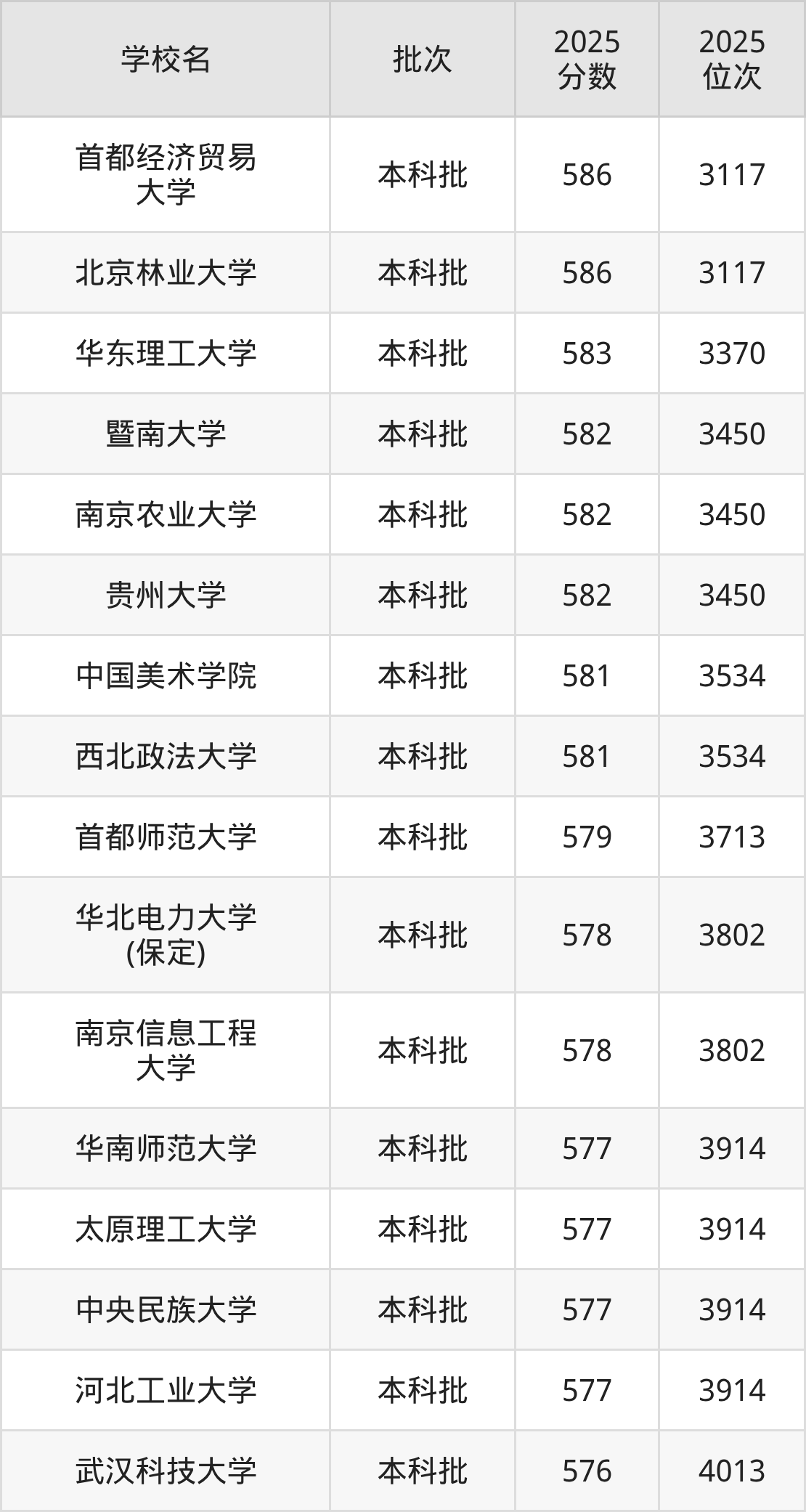 2025年辽宁高考历史类580分(3535名~3626名)录取位次低于该区间(较稳妥)的有首都师范大学(3713名)、南京信息工程大学(3802名)等;录取位次高于该区间(可冲)的有西北政法大学(3534名)、中国美术学院(3534名)等。