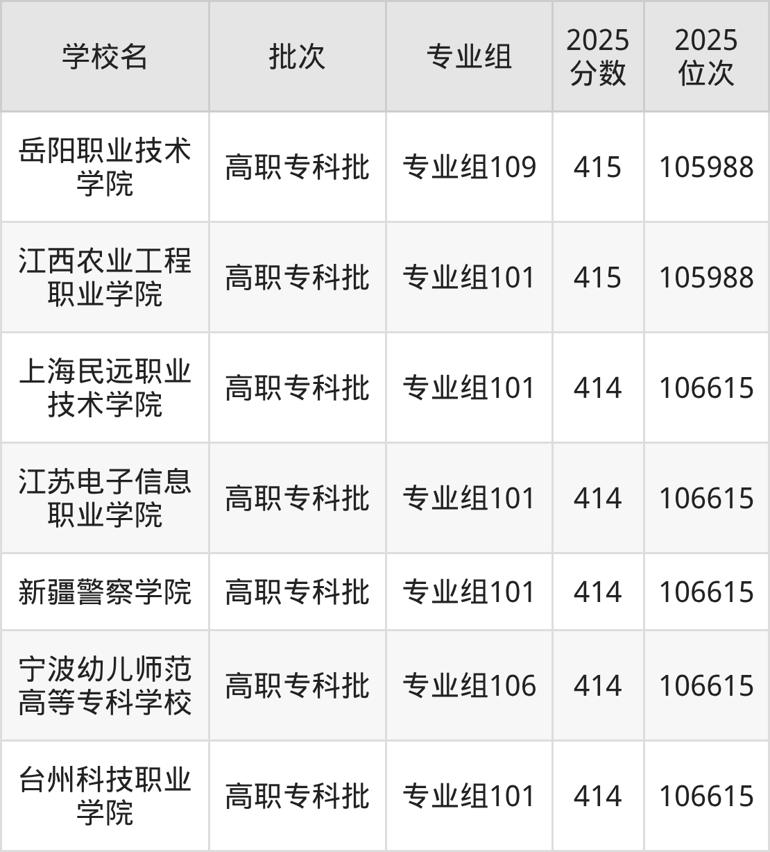 2025年四川高考历史类414分(105989名~106615名)能上的大学有台州科技职业学院专业组101、宁波幼儿师范高等专科学校专业组106、新疆警察学院专业组101、江苏电子信息职业学院专业组101等。