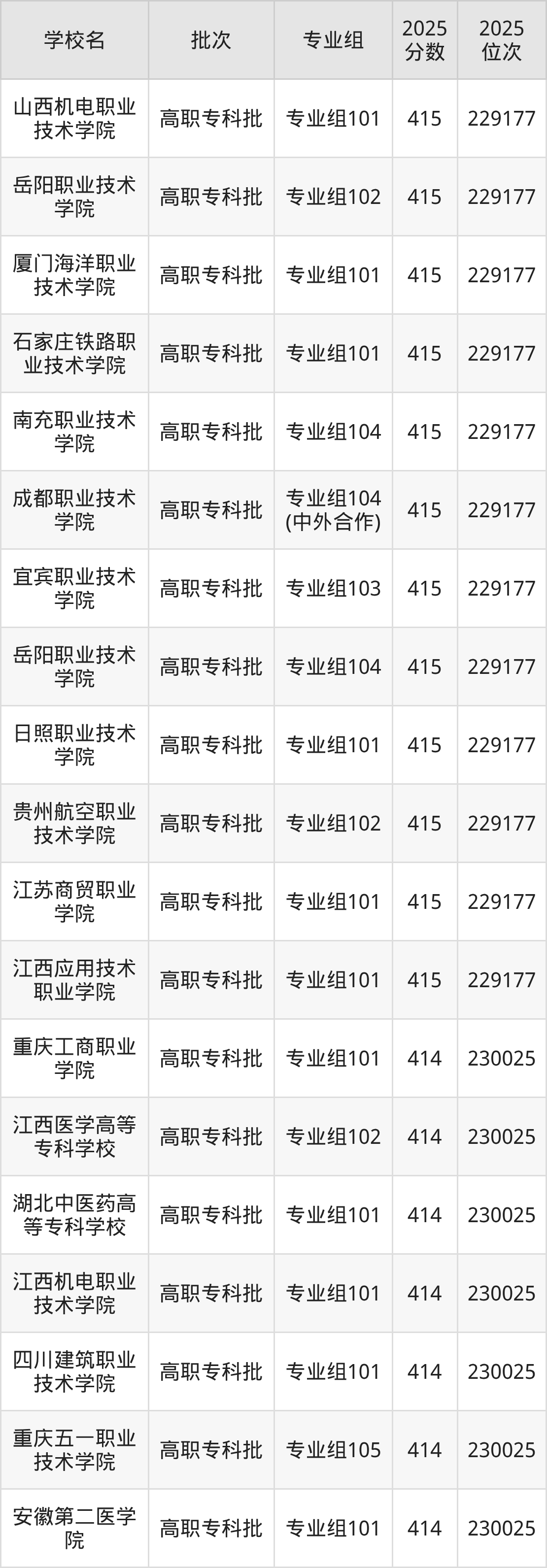 2025年四川高考物理类414分(229178名~230025名)能上的大学有重庆工商职业学院专业组101、重庆五一职业技术学院专业组105、江西医学高等专科学校专业组102、湖北中医药高等专科学校专业组101等。