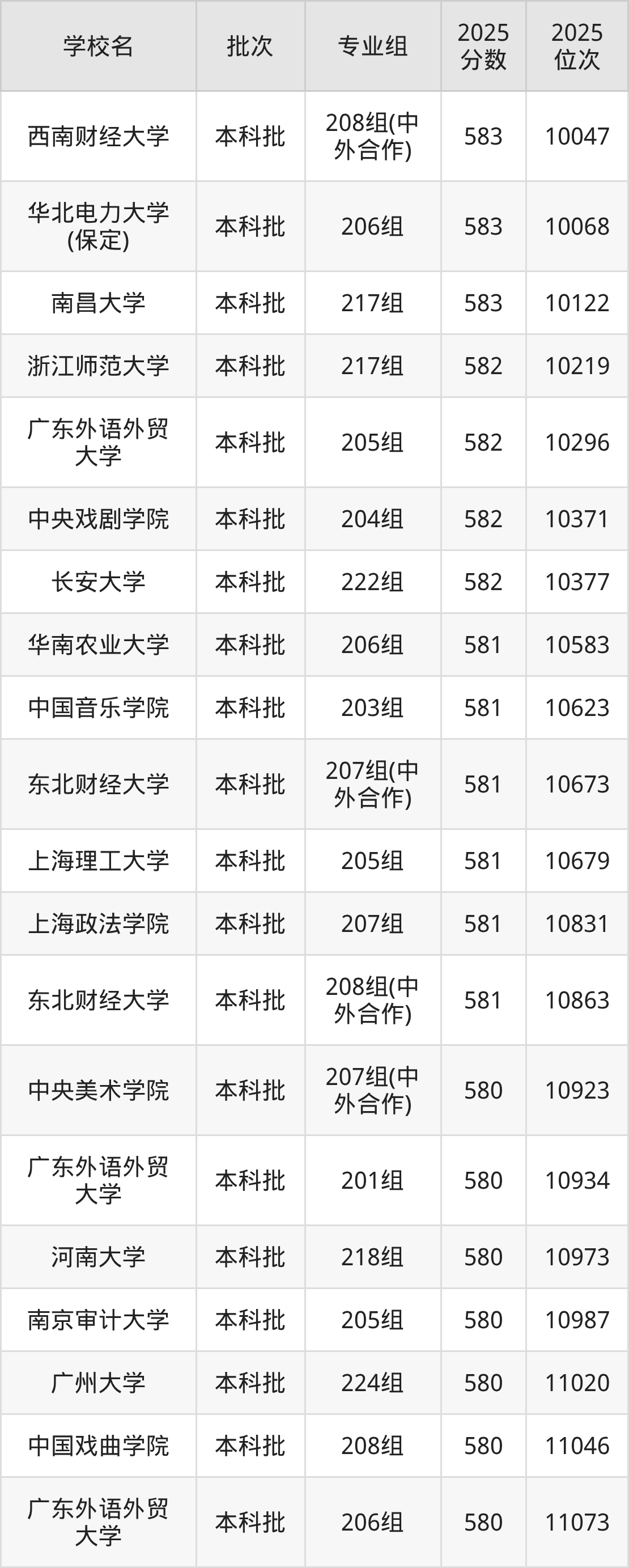 2025年广东高考历史类581分(10501名~10865名)能上的大学有中国音乐学院203组、东北财经大学207组(中外合作)、东北财经大学208组(中外合作)、上海理工大学205组等。
