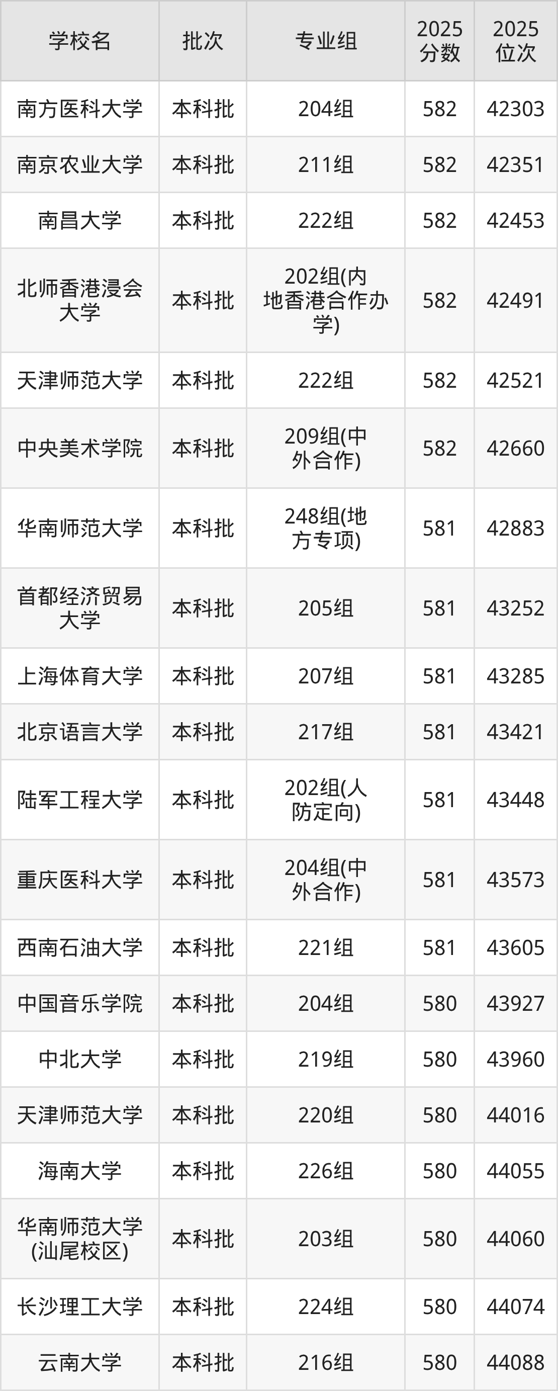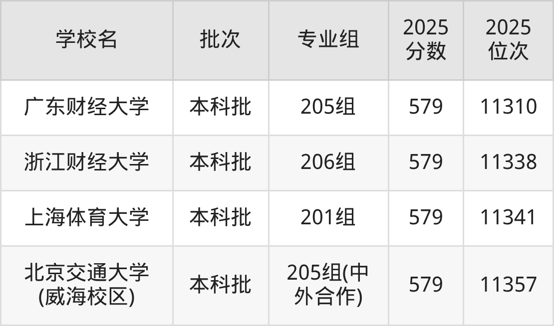 2025年广东高考物理类581分(42753名~43757名)能上的大学有北京语言大学217组、首都经济贸易大学205组、上海体育大学207组、华南师范大学248组(地方专项)等。