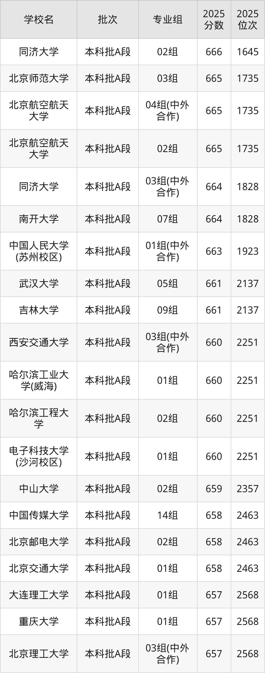 2025年天津高考660分(2138名~2251名)能上的大学有电子科技大学(沙河校区)01组、哈尔滨工程大学02组、哈尔滨工业大学(威海)01组、西安交通大学03组(中外合作)。