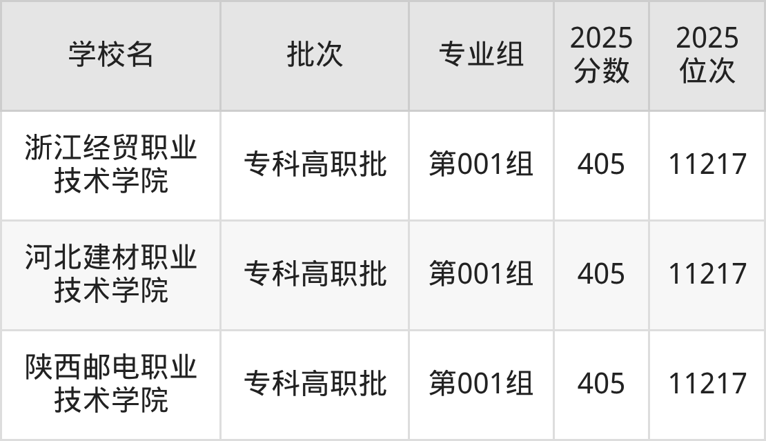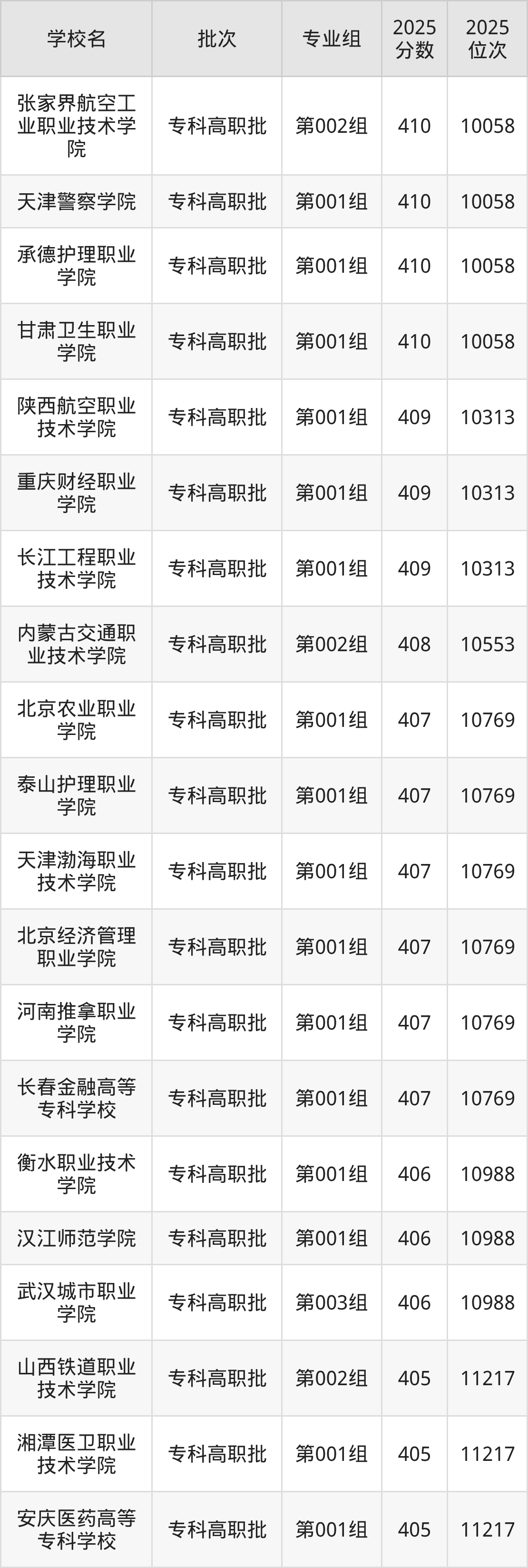 2025年山西高考历史类407分(10554名~10769名)能上的大学有北京农业职业学院第001组、北京经济管理职业学院第001组、天津渤海职业技术学院第001组、长春金融高等专科学校第001组等。