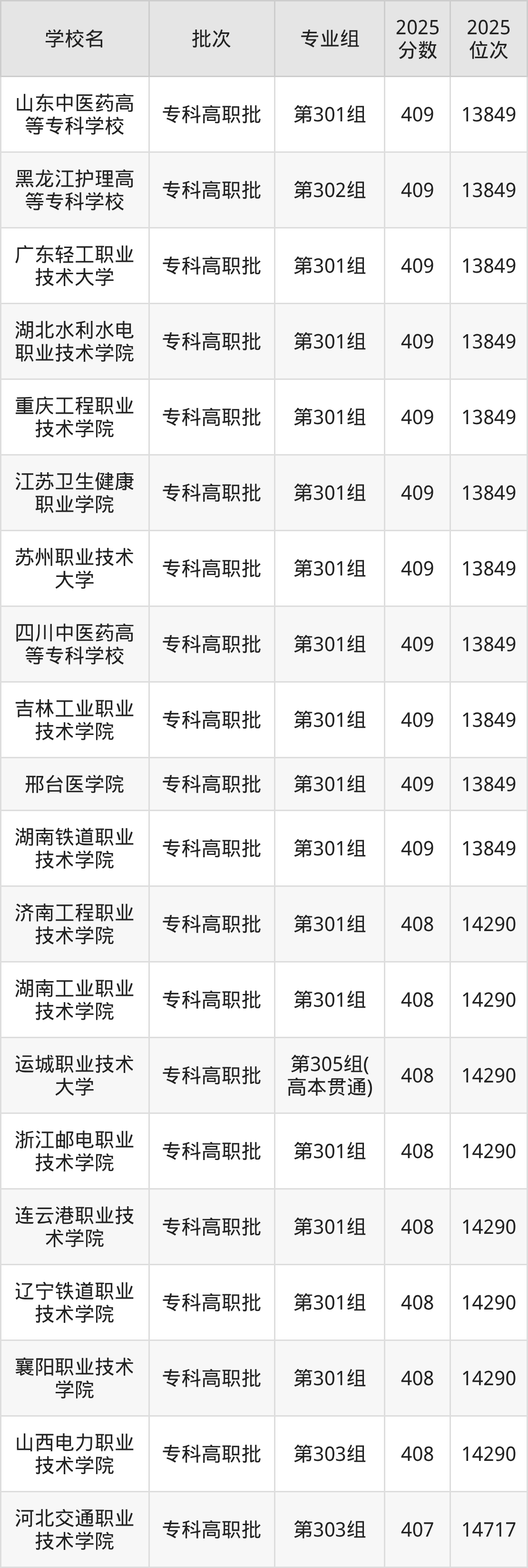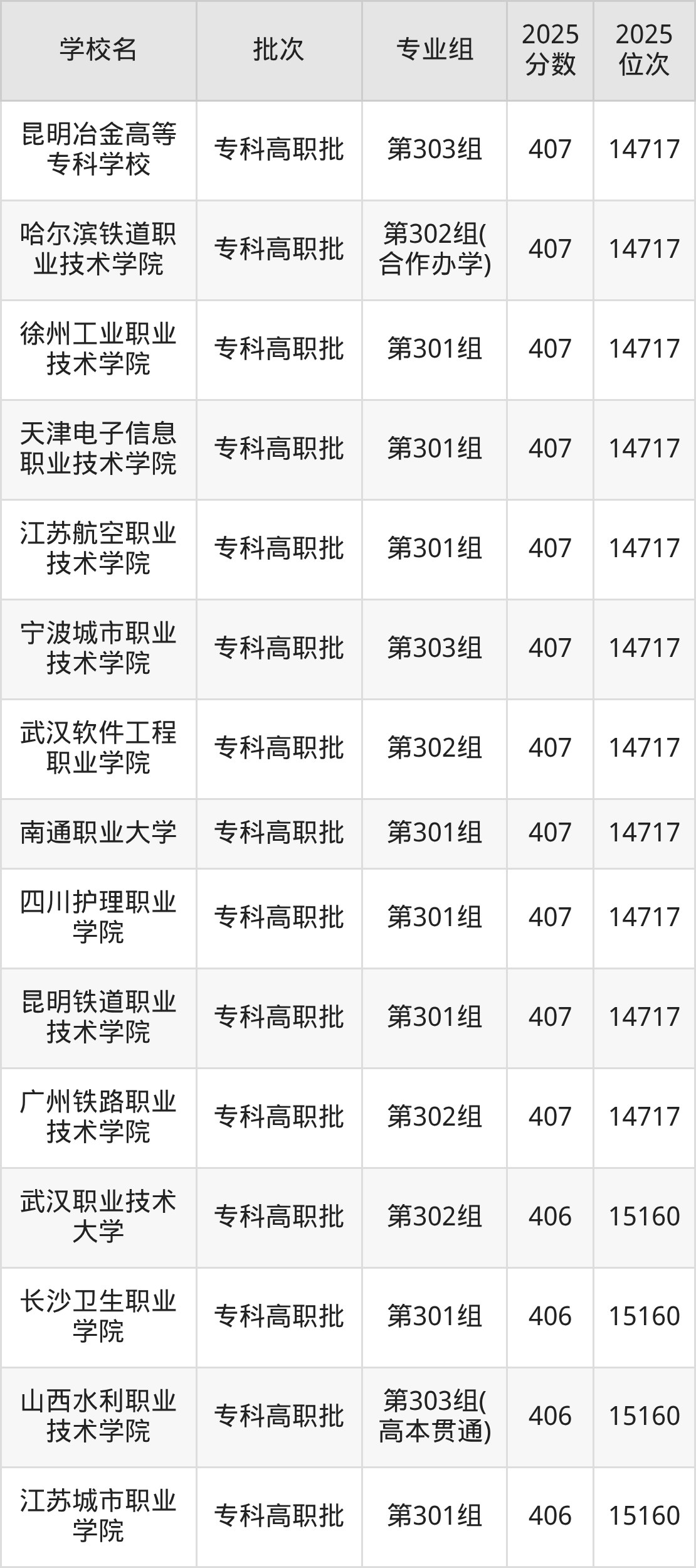 2025年山西高考物理类407分(14291名~14717名)能上的大学有天津电子信息职业技术学院第301组、河北交通职业技术学院第303组、哈尔滨铁道职业技术学院第302组(合作办学)、南通职业大学第301组等。