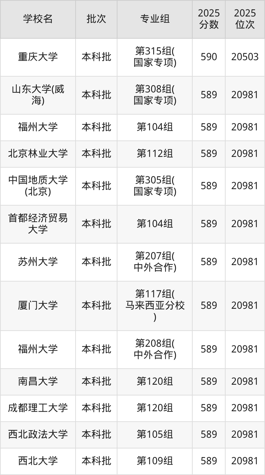 2025年湖南高考物理类589分(20504名~20981名)能上的大学有北京林业大学第112组、中国地质大学(北京)第305组(国家专项)、首都经济贸易大学第104组、苏州大学第207组(中外合作)等。
