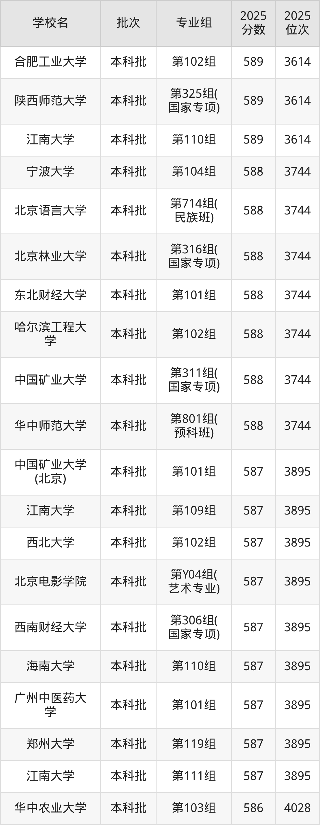 2025年湖南高考历史类589分(3480名~3614名)能上的大学有华东政法大学第801组(预科班)、中国矿业大学第103组、南京师范大学第308组(国家专项)、江南大学第110组等。