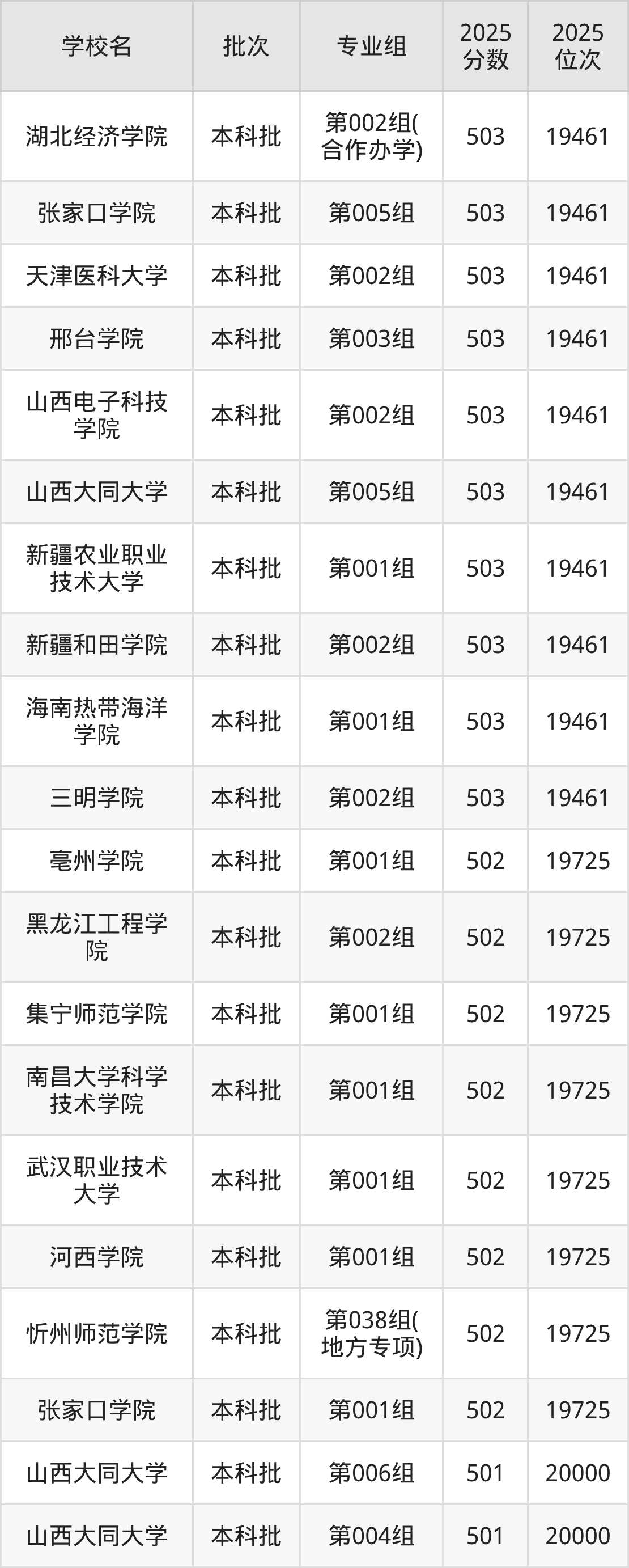 2025年山西高考历史类501分(19726名~20000名)能上的大学有天津城建大学第005组(合作办学)、南京理工大学紫金学院第001组、滨州医学院第001组、信阳学院第001组等。