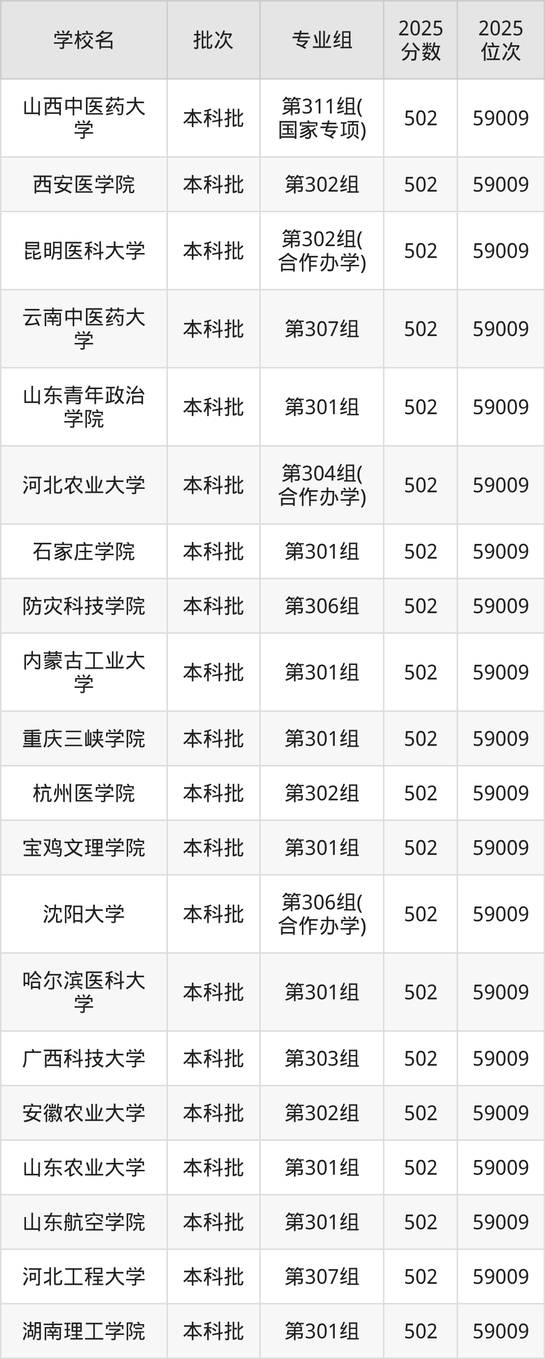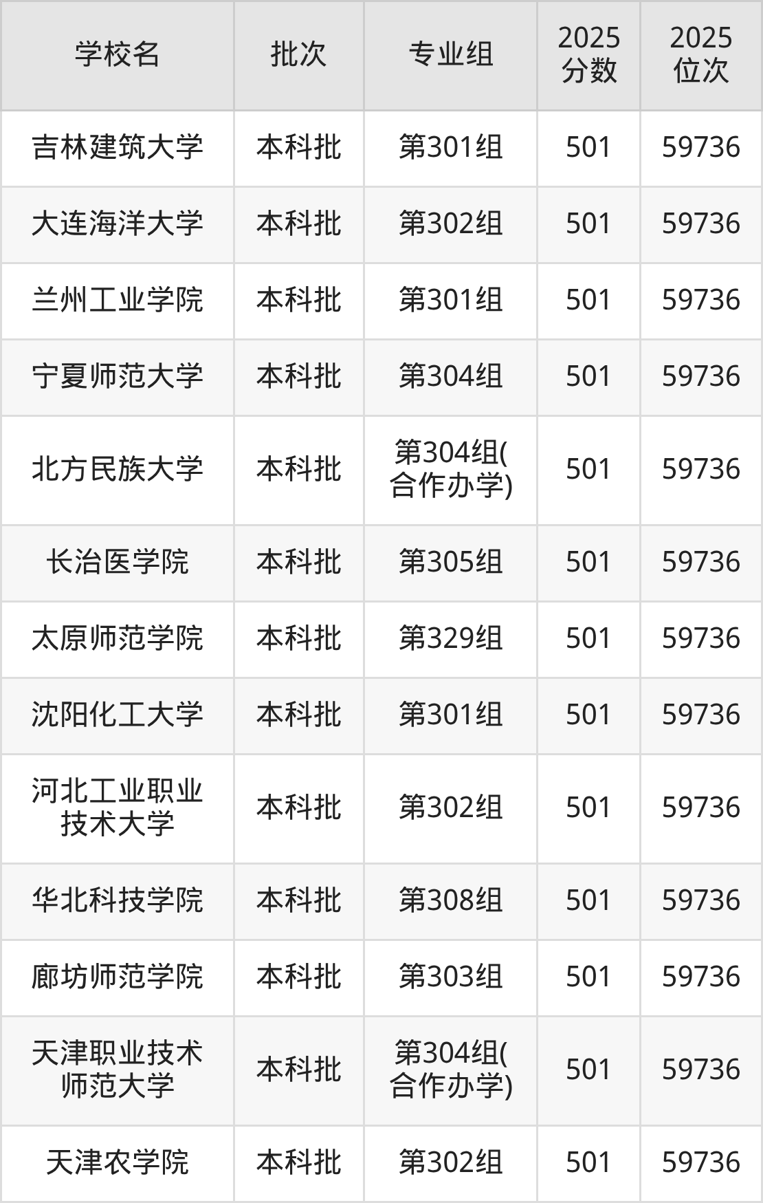 2025年山西高考物理类501分(59010名~59736名)能上的大学有天津农学院第302组、天津职业技术师范大学第304组(合作办学)、廊坊师范学院第303组、华北科技学院第308组等。