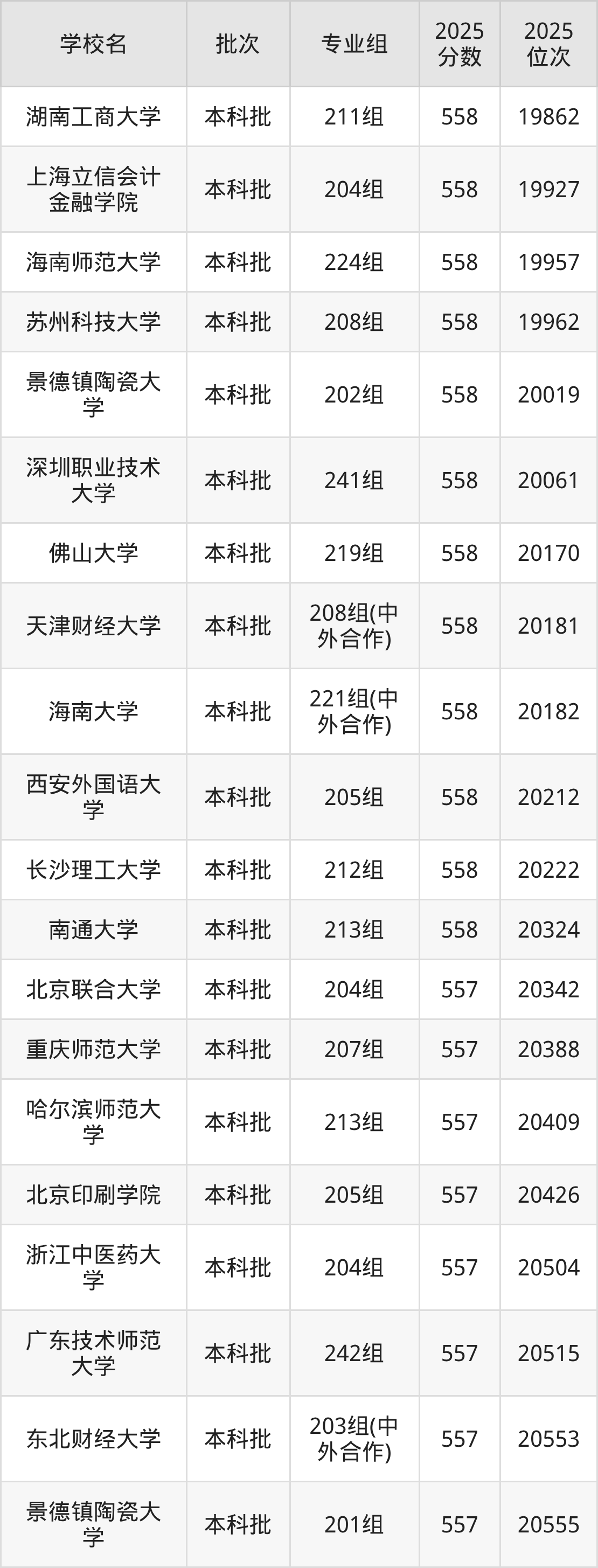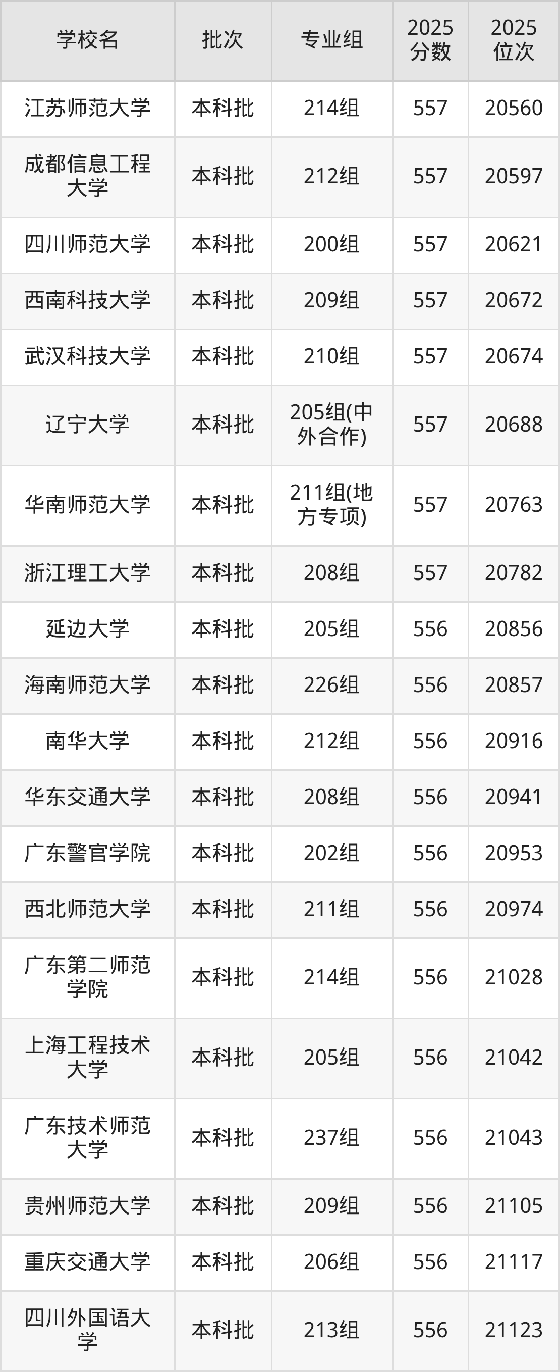 2025年广东高考历史类557分(20330名~20815名)能上的大学有北京印刷学院205组、辽宁大学205组(中外合作)、东北财经大学203组(中外合作)、哈尔滨师范大学213组等。