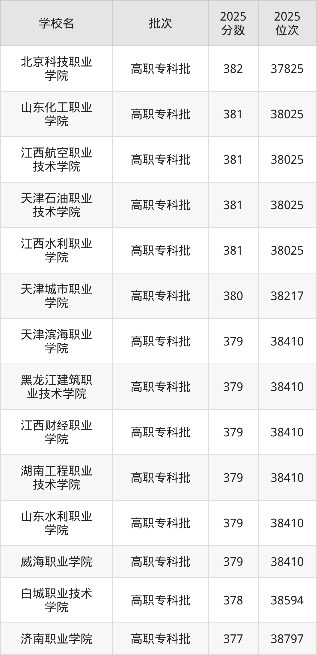 2025年辽宁高考历史类379分(38218名~38410名)能上的大学有威海职业学院、山东水利职业学院、湖南工程职业技术学院、江西财经职业学院等。