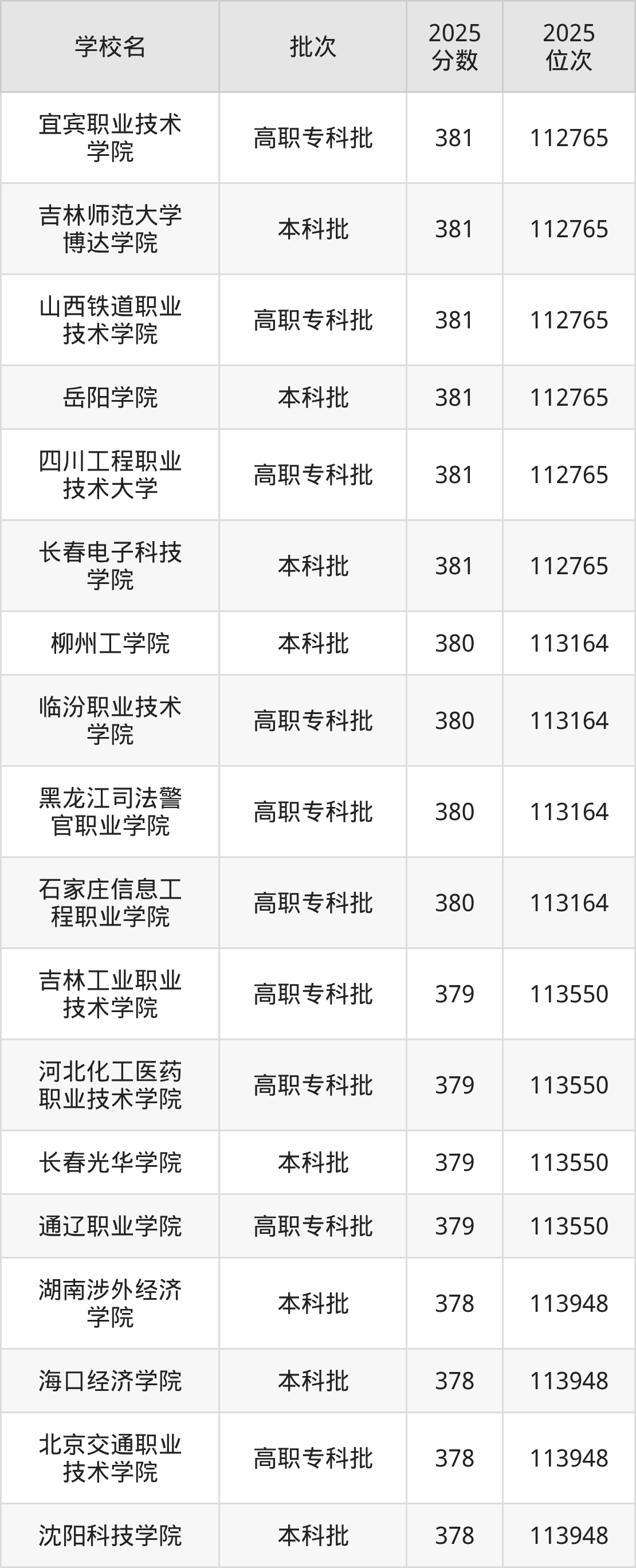 2025年辽宁高考物理类379分(113165名~113550名)能上的大学有通辽职业学院、长春光华学院、河北化工医药职业技术学院、吉林工业职业技术学院。