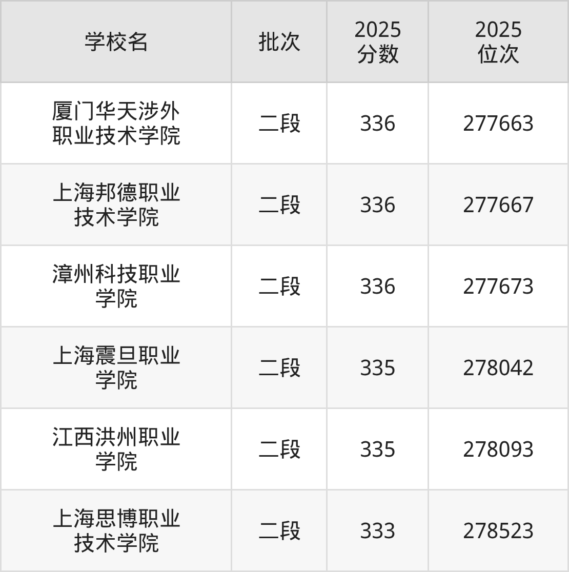浙江高考335分:排名278127位。该分数位次对应能上的大学有江西洪州职业学院、上海震旦职业学院,更多名单如下文所示,2026届考生可参考。