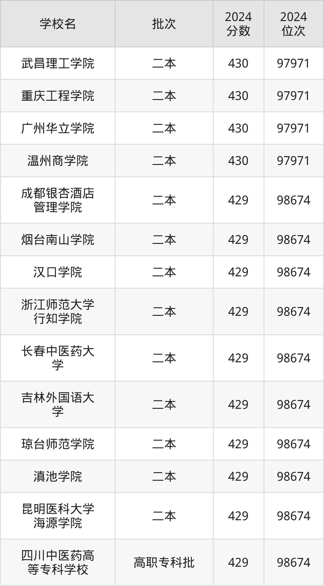 2024年云南高考理科429分(97972名~98674名)能上的大学有浙江师范大学行知学院、汉口学院、烟台南山学院、长春中医药大学等。