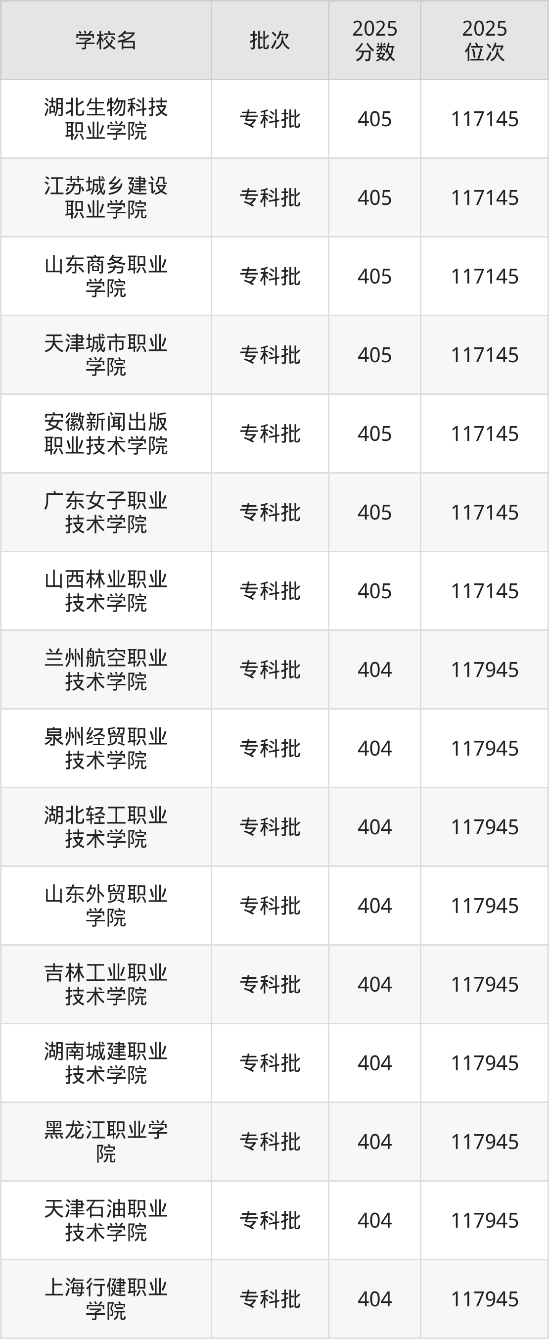 2025年河北高考历史类404分(117146名~117945名)能上的大学有上海行健职业学院、天津石油职业技术学院、黑龙江职业学院、湖南城建职业技术学院等。