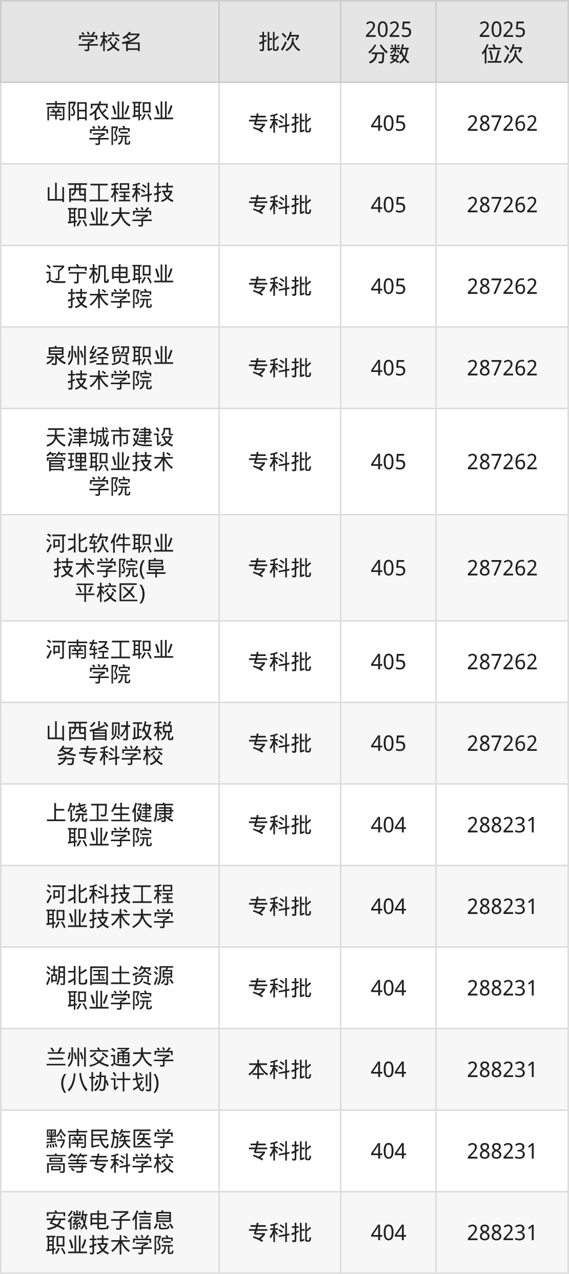 2025年河北高考物理类404分(287263名~288231名)能上的大学有黔南民族医学高等专科学校、安徽电子信息职业技术学院、湖北国土资源职业学院、兰州交通大学(八协计划)等。