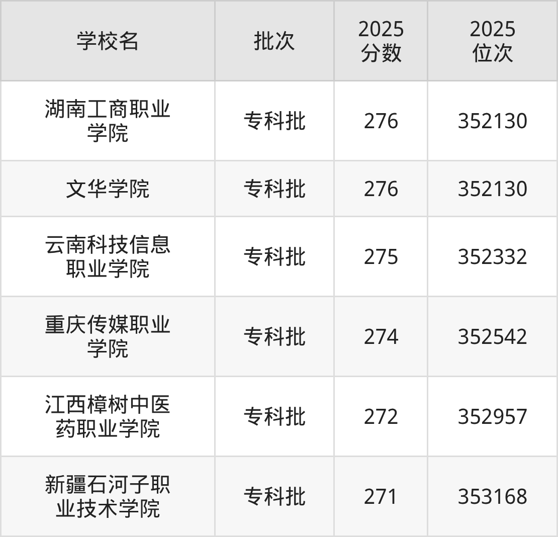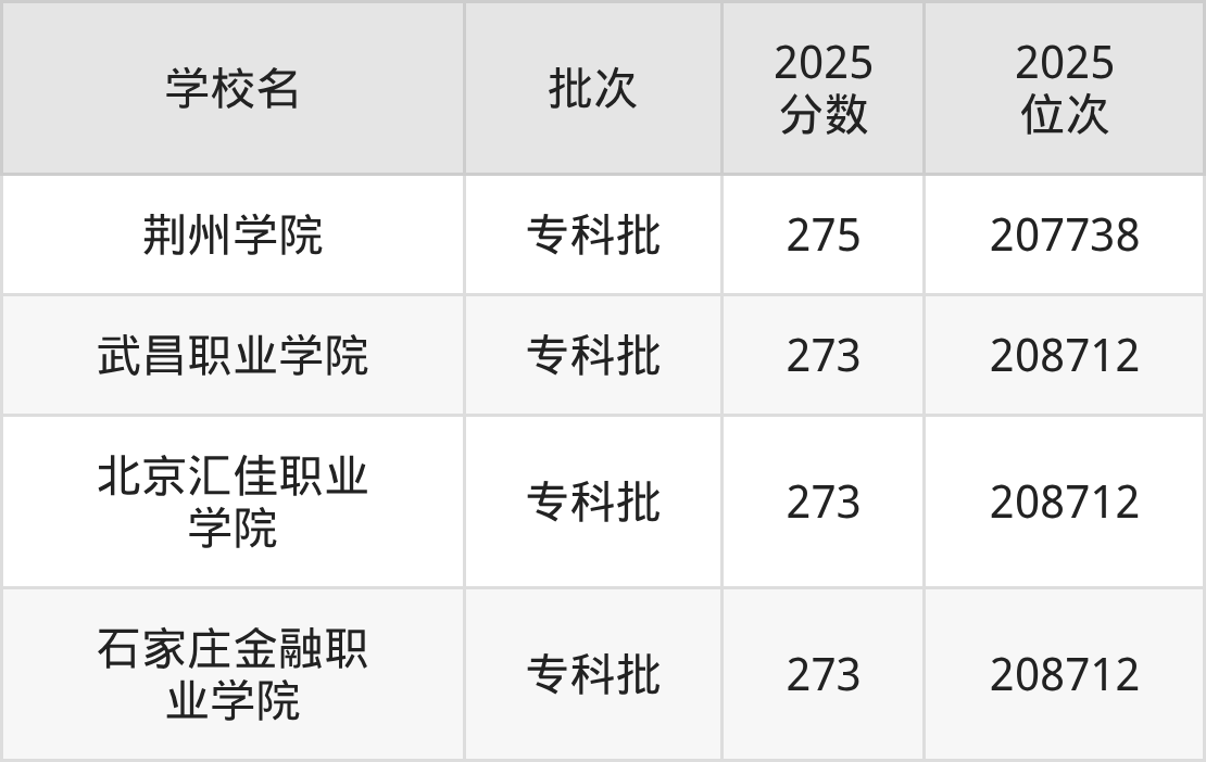 2025年河北高考历史类273分(208227名~208712名)能上的大学有石家庄金融职业学院、北京汇佳职业学院、武昌职业学院。