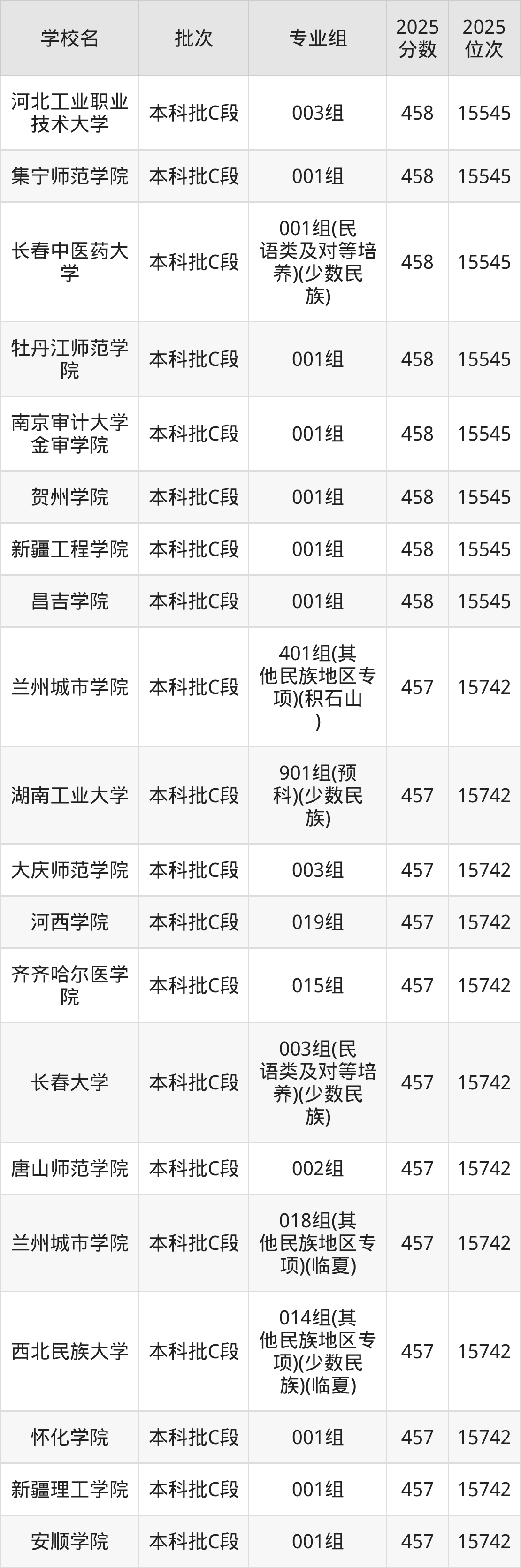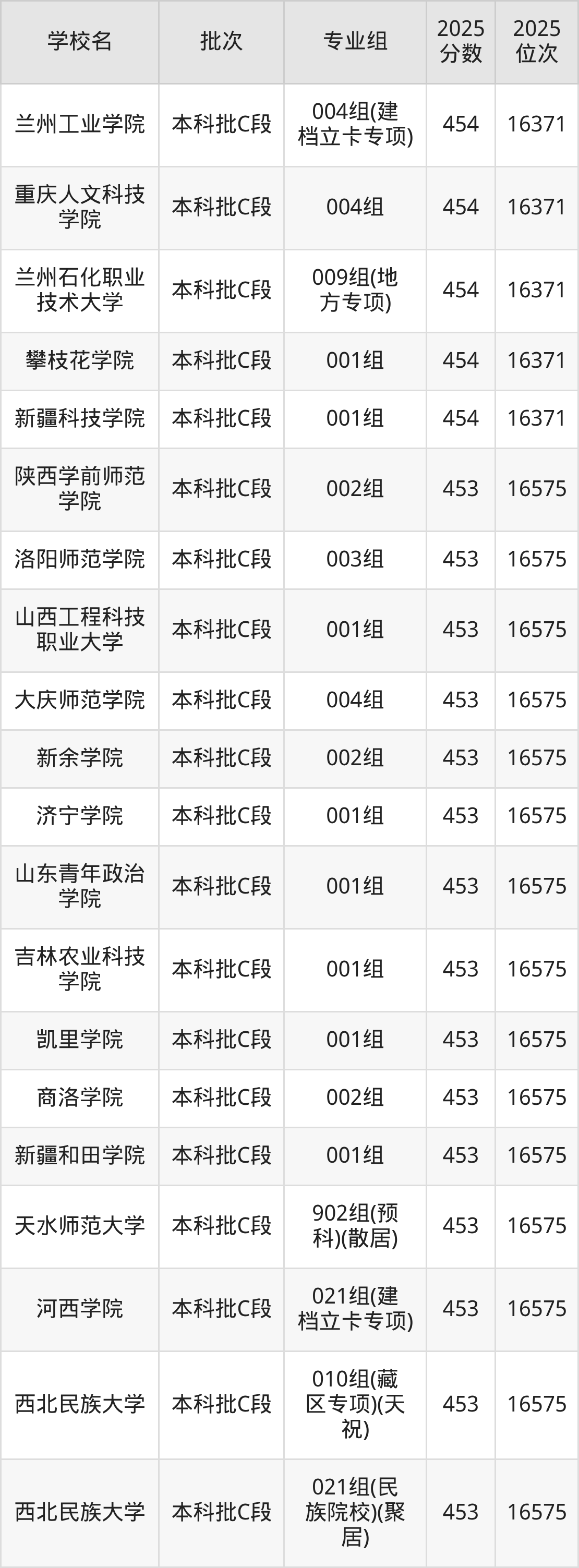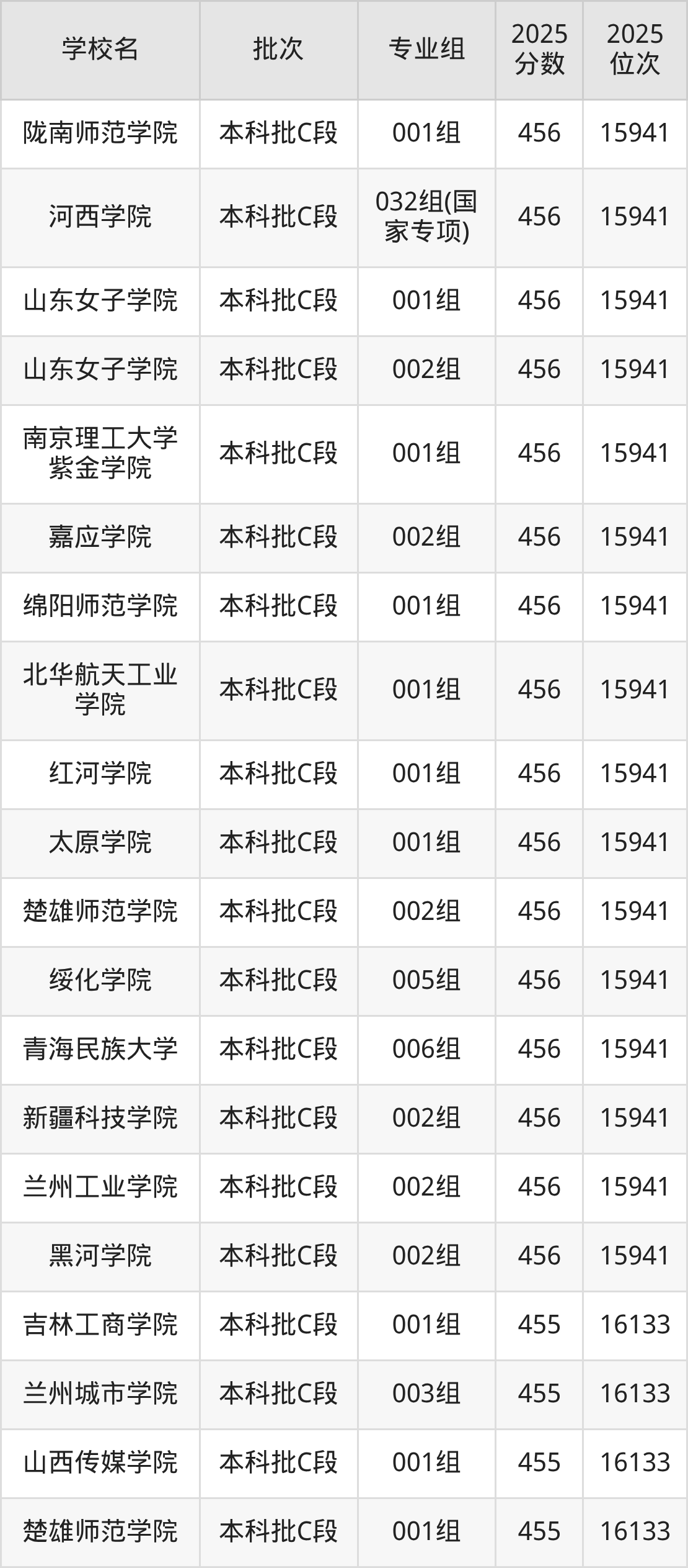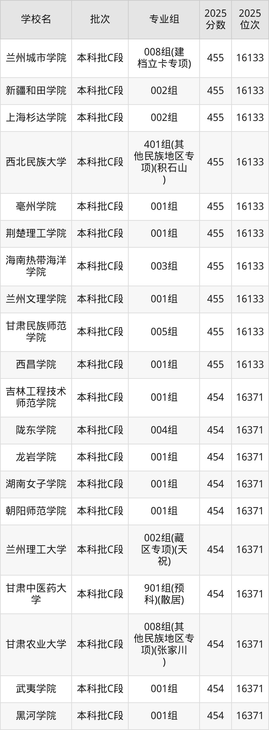 2025年甘肃高考历史类455分(15942名~16133名)能上的大学有山西传媒学院001组、吉林工商学院001组、上海杉达学院002组、亳州学院001组等。