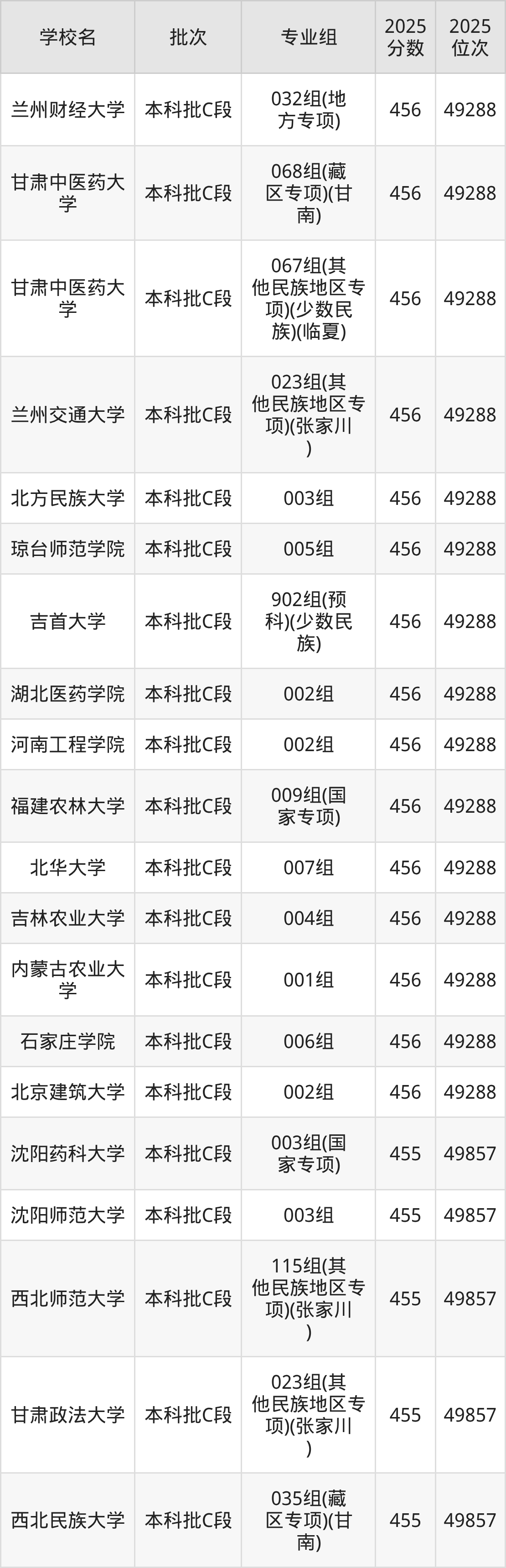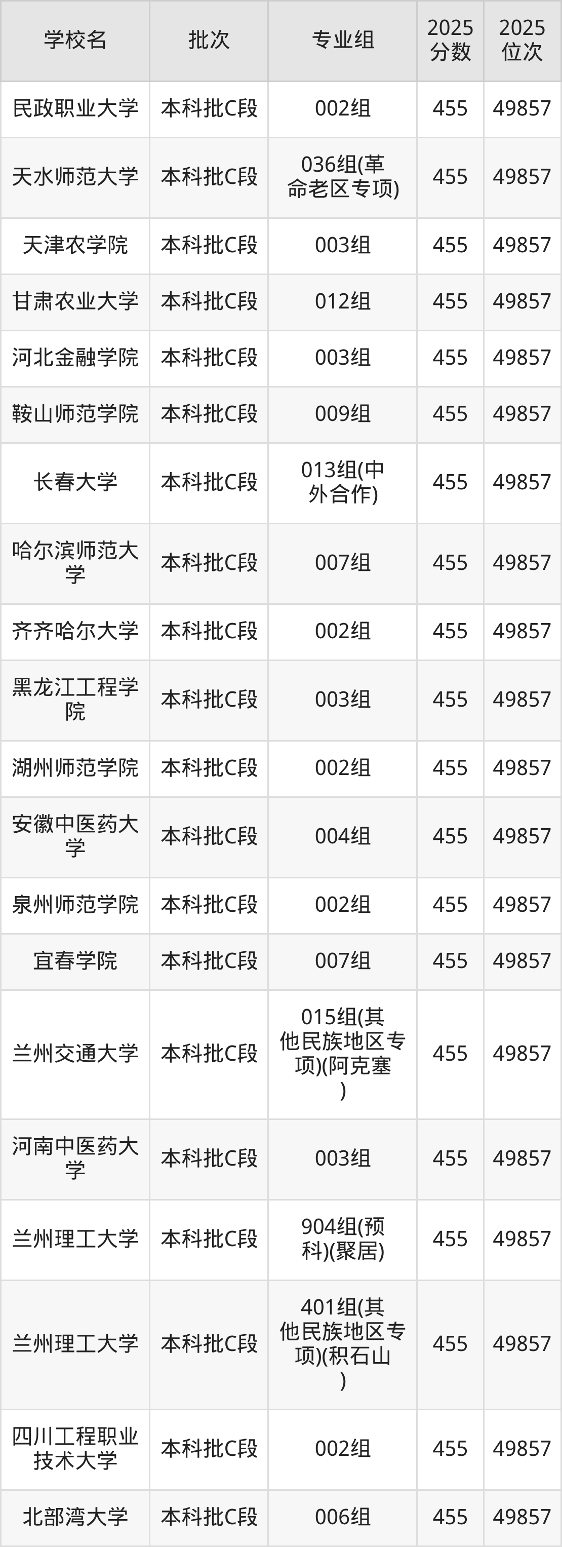 2025年甘肃高考物理类455分(49289名~49857名)能上的大学有民政职业大学002组、天津农学院003组、河北金融学院003组、沈阳药科大学003组(国家专项)等。