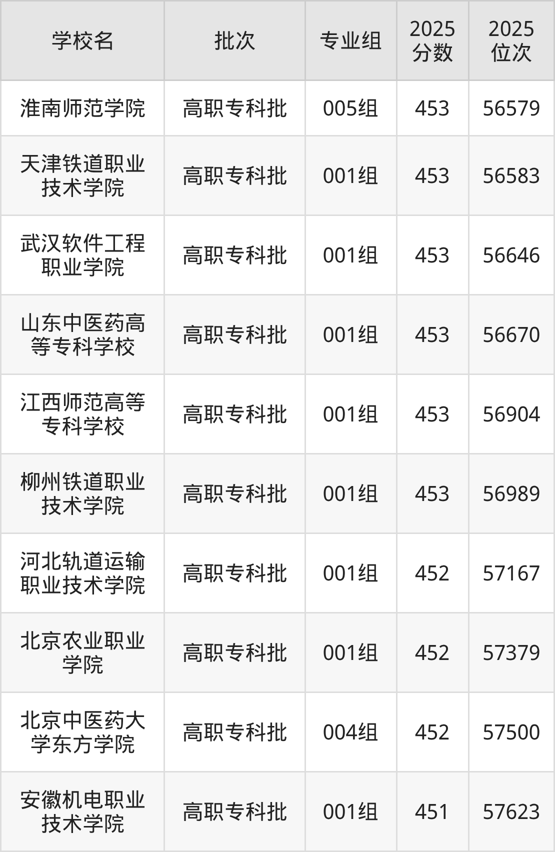 2025年安徽高考历史类452分(57016名~57562名)能上的大学有北京农业职业学院001组、河北轨道运输职业技术学院001组、北京中医药大学东方学院004组。