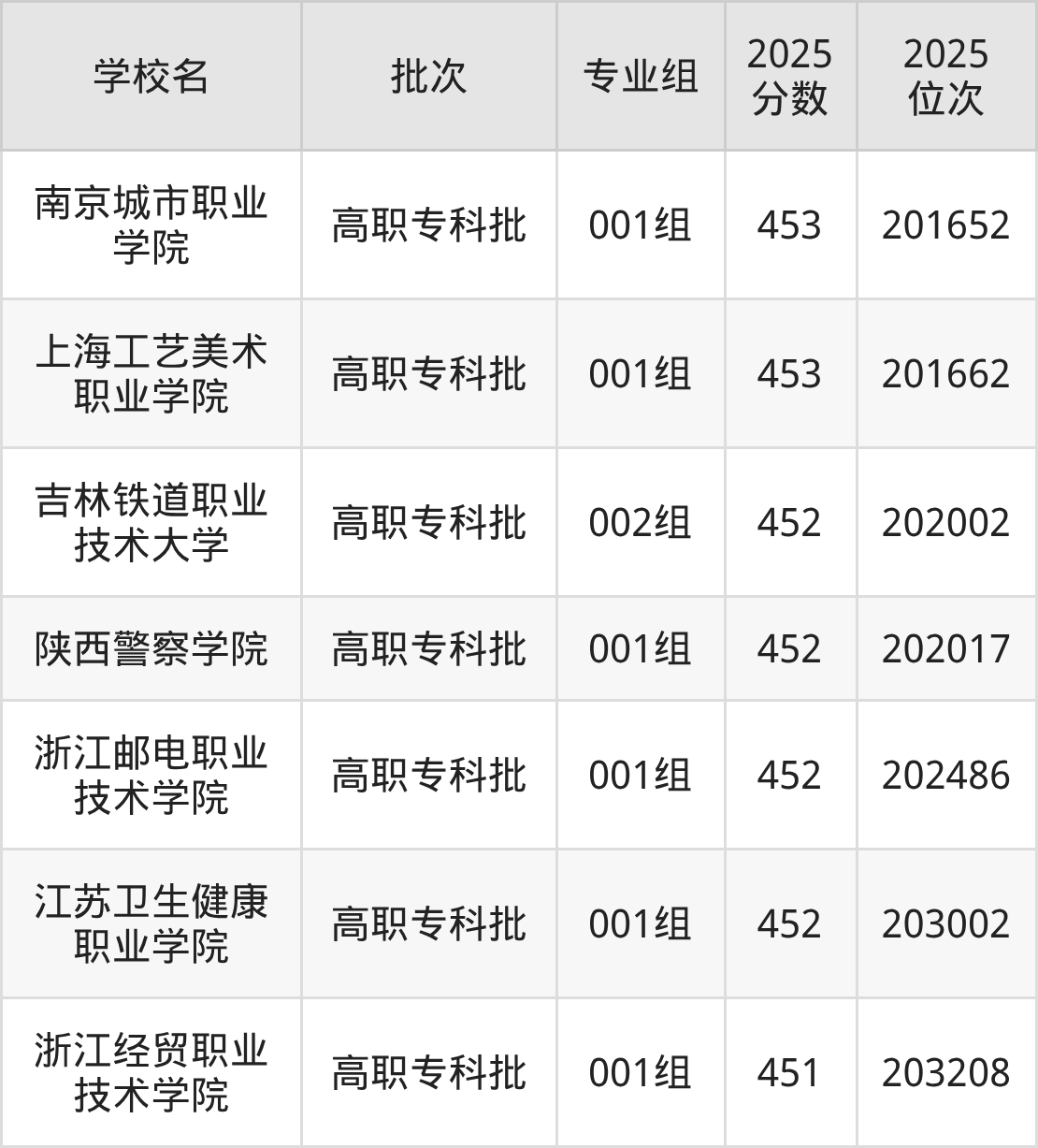 2025年安徽高考物理类452分(201938名~203193名)能上的大学有吉林铁道职业技术大学002组、江苏卫生健康职业学院001组、陕西警察学院001组、浙江邮电职业技术学院001组。