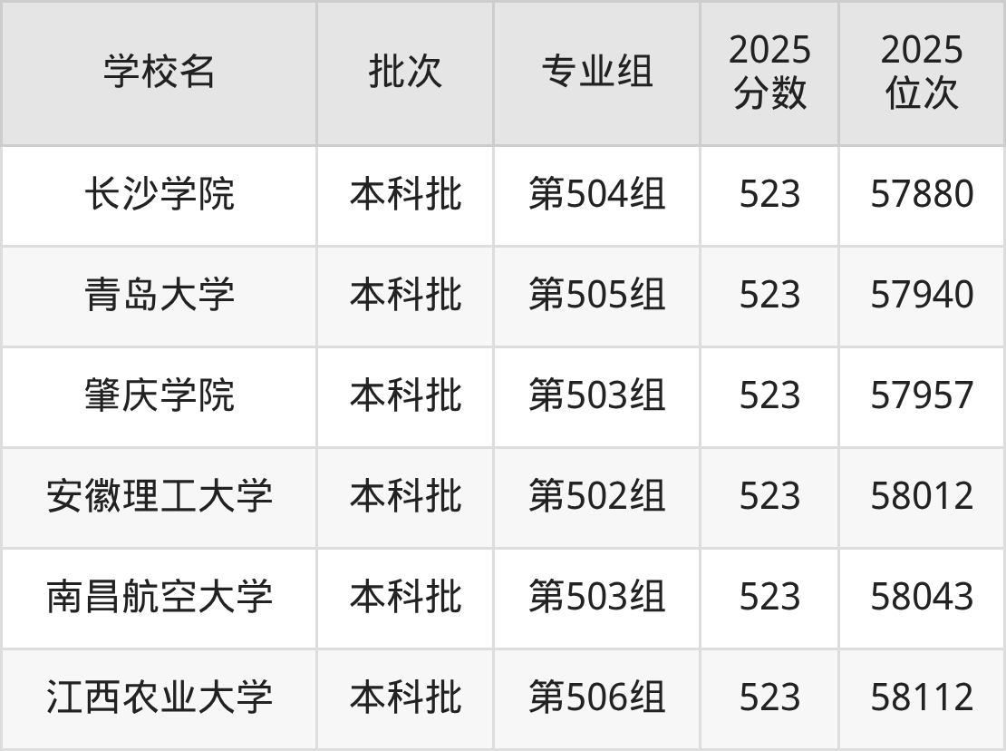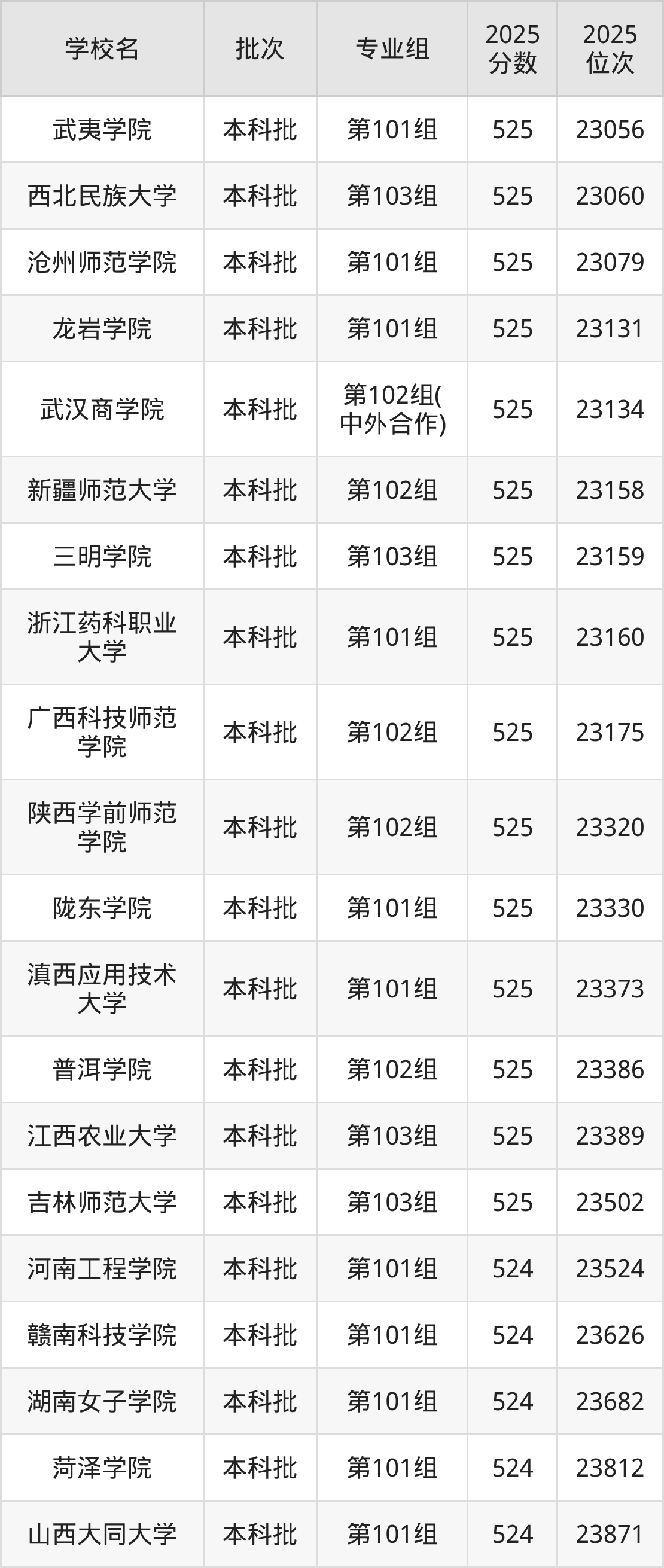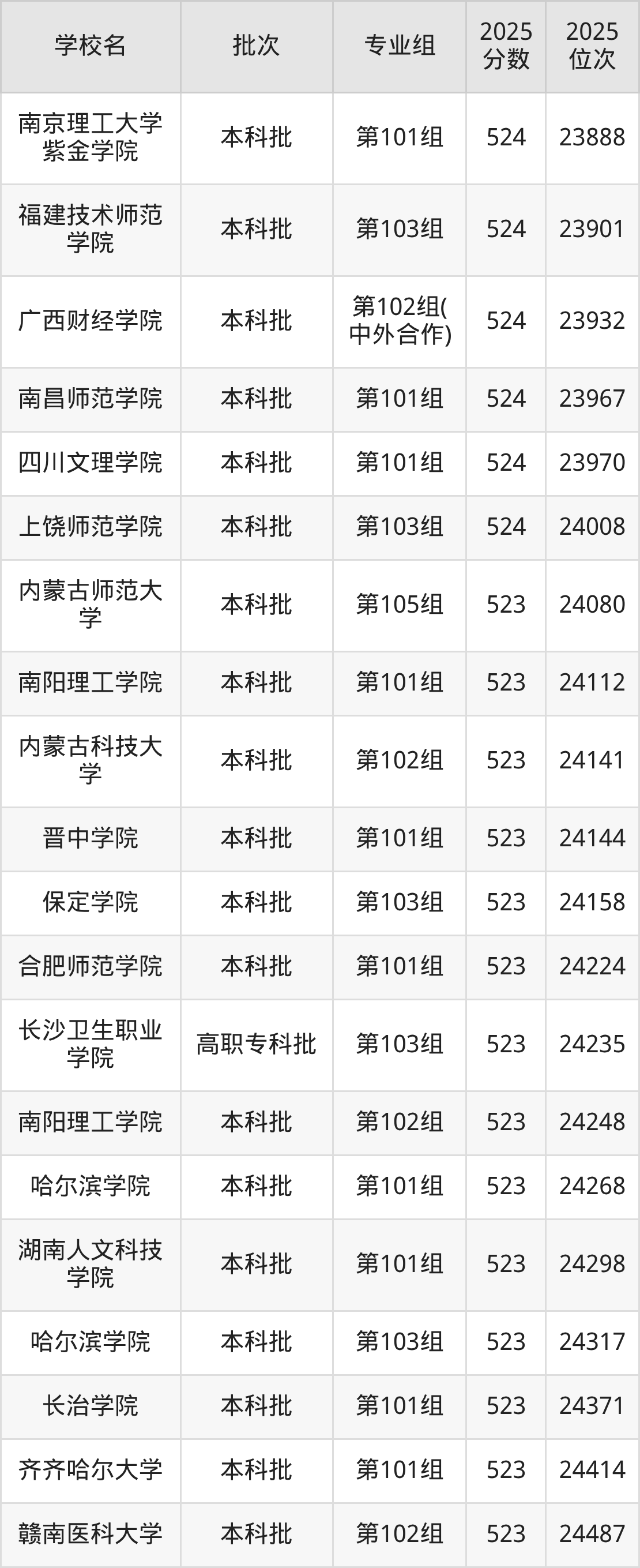 2025年江西高考历史类524分(23508名~24020名)能上的大学有山西大同大学第101组、菏泽学院第101组、河南工程学院第101组、湖南女子学院第101组等。
