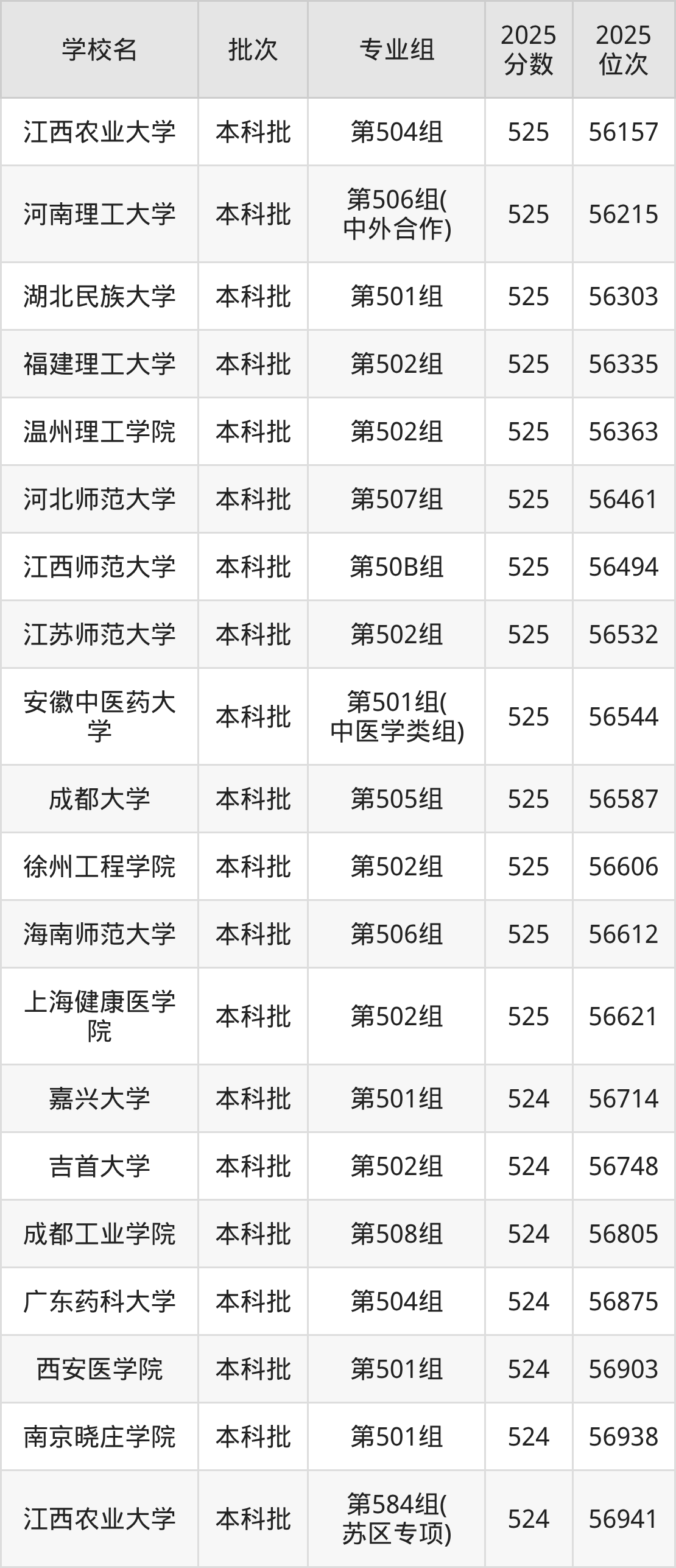 2025年江西高考物理类524分(56653名~57614名)能上的大学有山东师范大学第503组(中外合作)、云南师范大学第504组、长春理工大学第501组、南京晓庄学院第501组等。