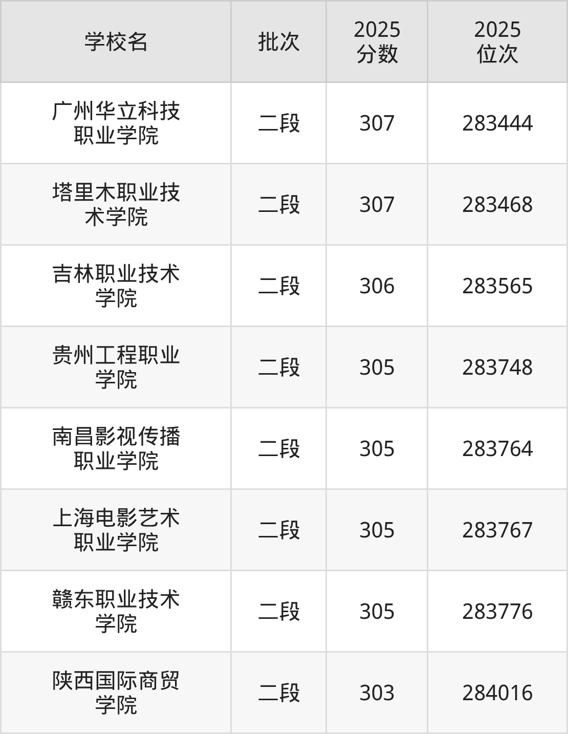 这些都是2026年高考283871名~284013名考生可以报考的大学,更多学校名单如下表所示: