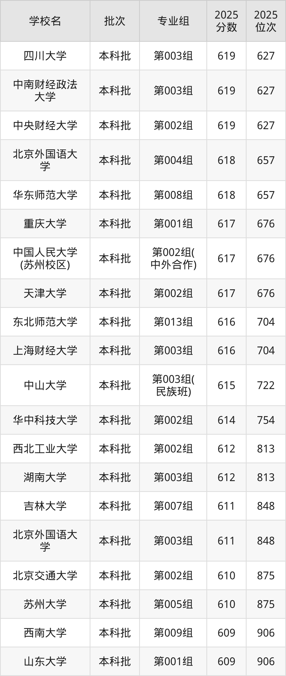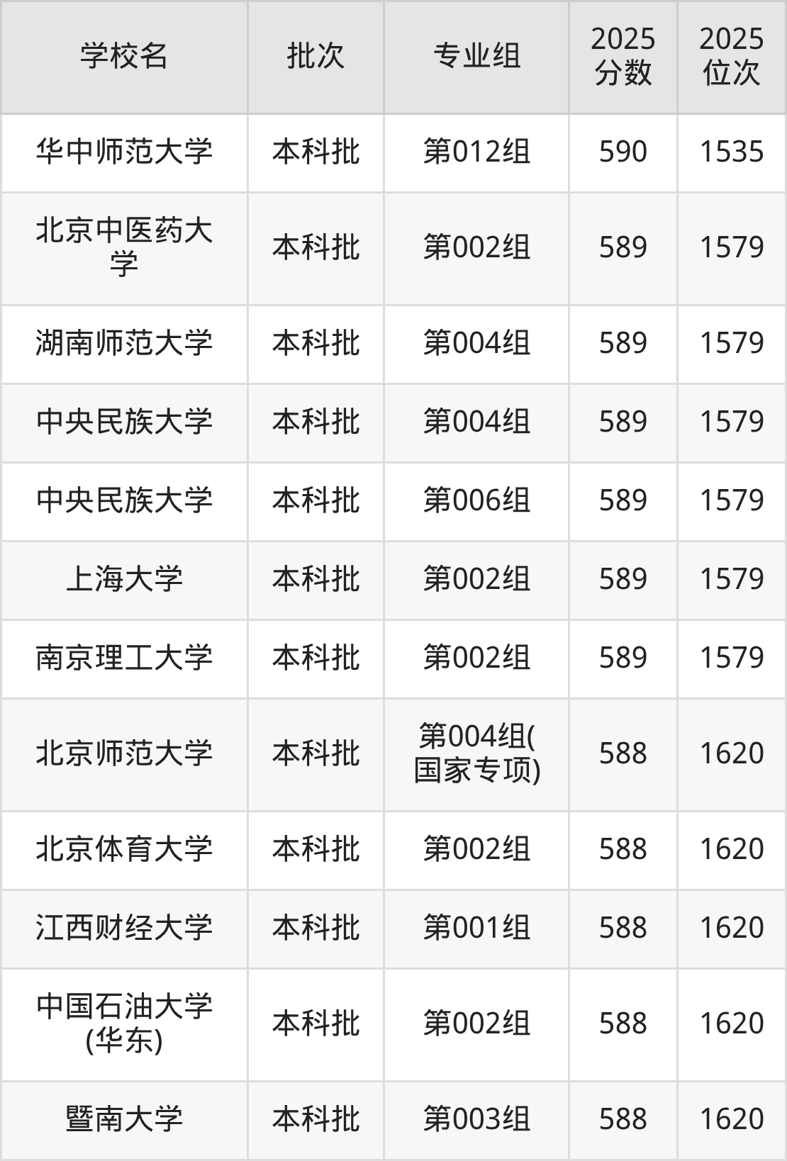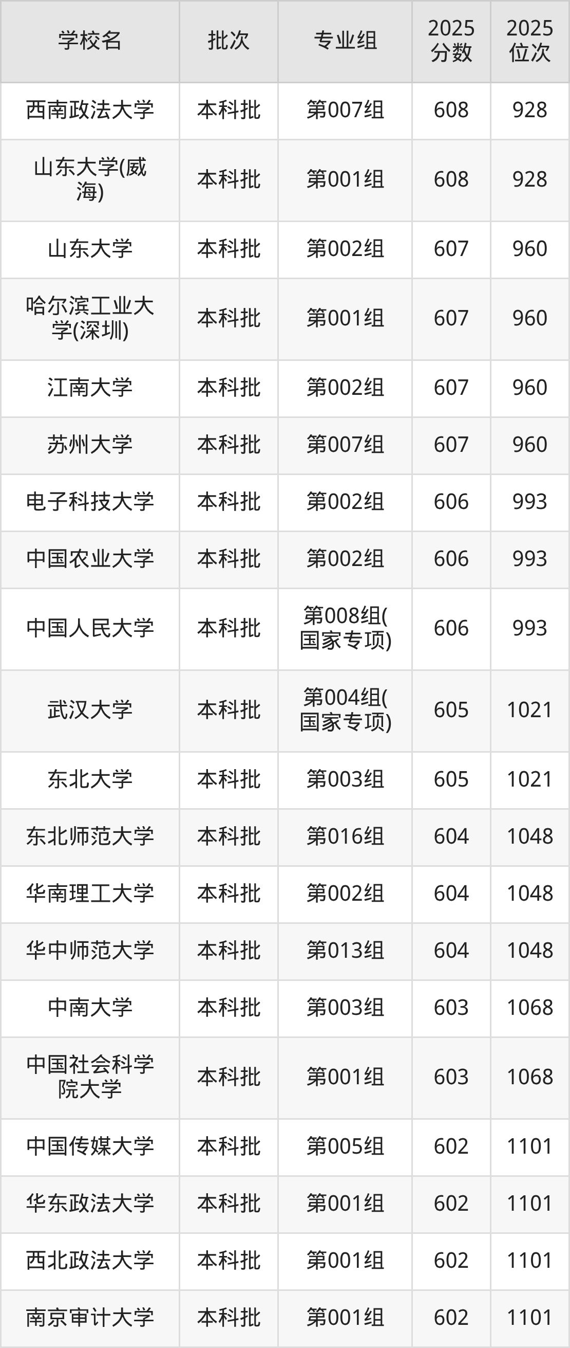2025年吉林高考历史类601分(1102名~1144名)能上的大学有中国传媒大学第006组、中国海洋大学第004组(中外合作)、华南师范大学第002组、陕西师范大学第009组。