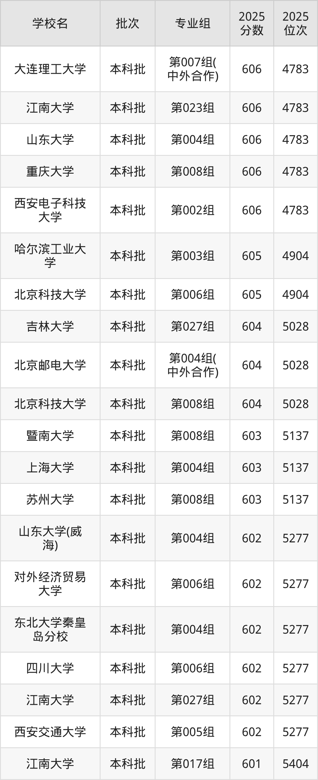 2025年吉林高考物理类601分(5278名~5404名)能上的大学有北京科技大学第007组、上海财经大学第004组、江南大学第017组、南京信息工程大学第002组。