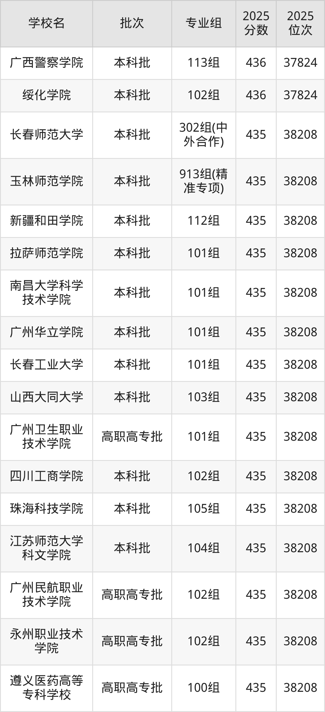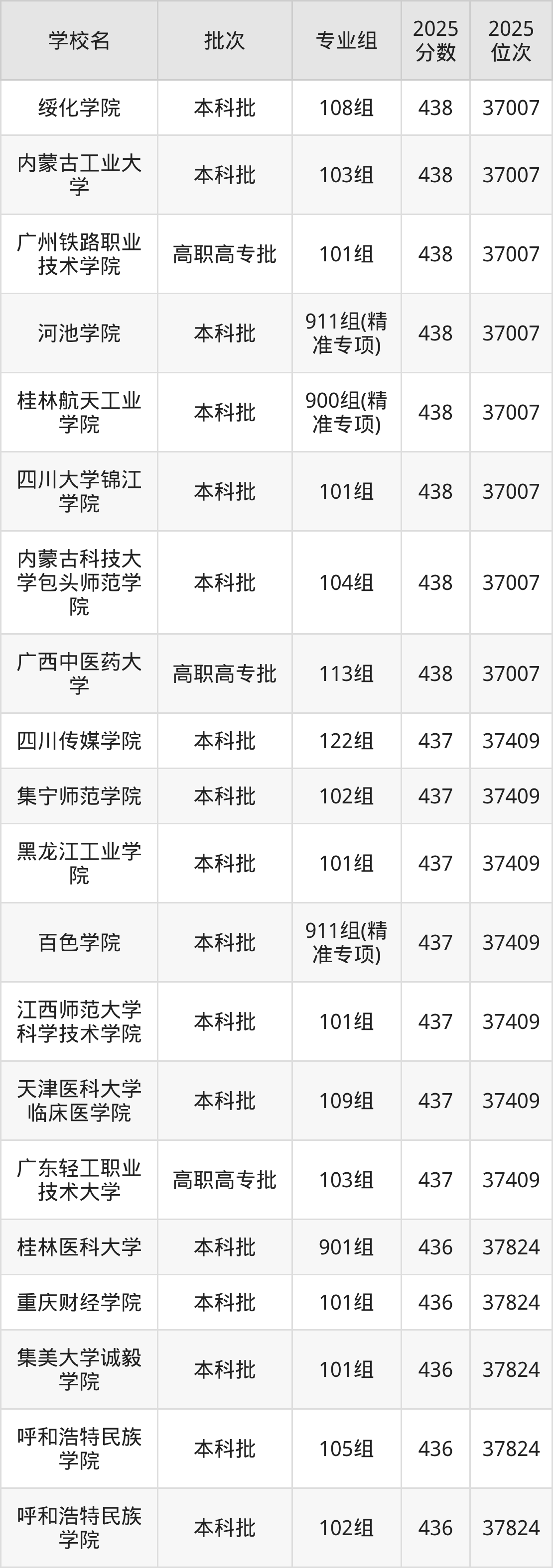 2025年广西高考历史类436分(37410名~37824名)能上的大学有绥化学院102组、桂林医科大学901组、广西警察学院113组、呼和浩特民族学院102组等。