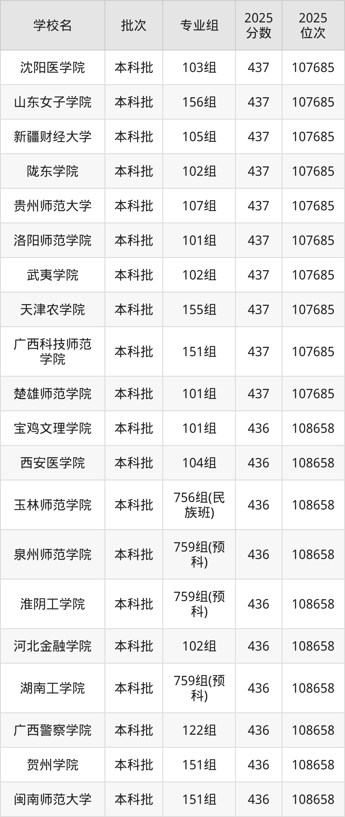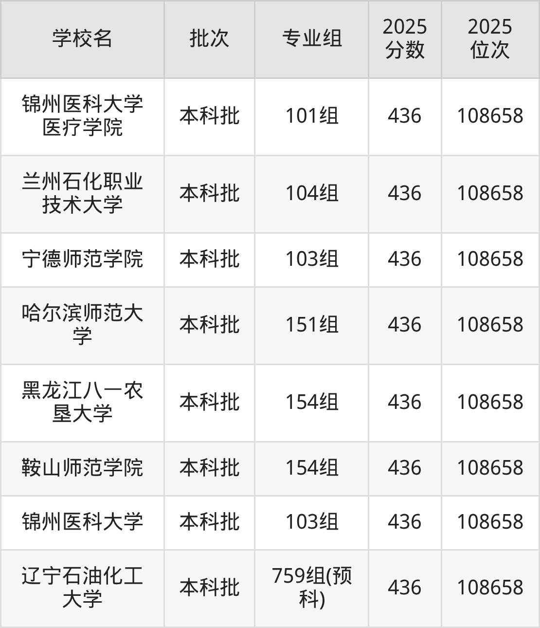 2025年广西高考物理类436分(107686名~108658名)能上的大学有辽宁石油化工大学759组(预科)、锦州医科大学103组、鞍山师范学院154组、黑龙江八一农垦大学154组等。