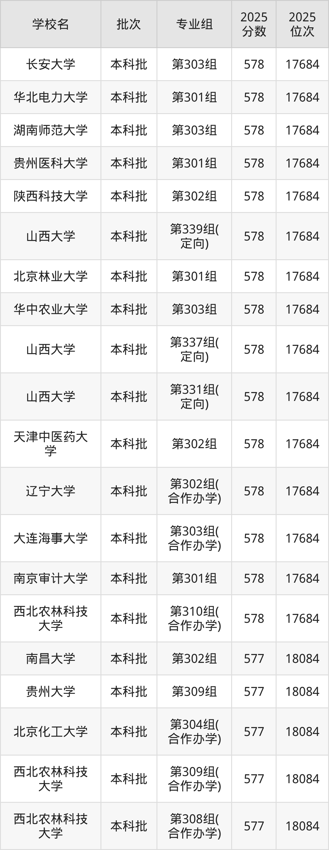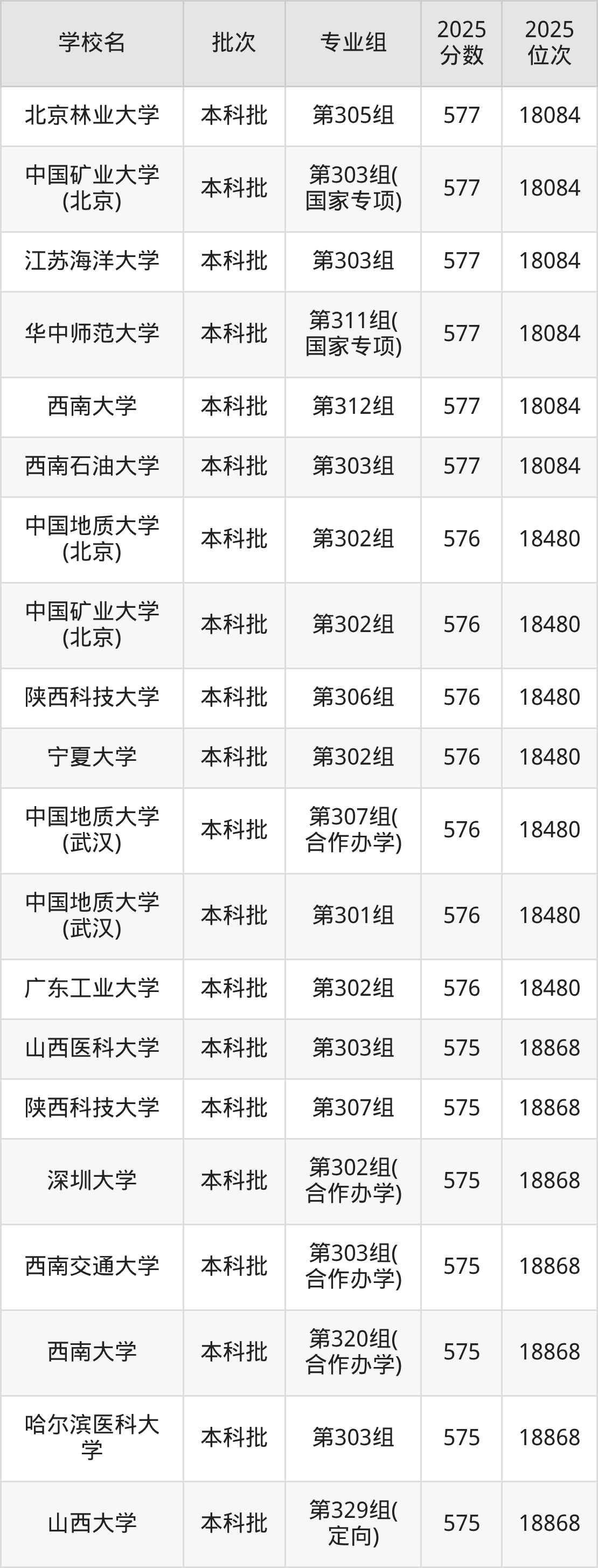 2025年山西高考物理类576分(18085名~18480名)能上的大学有中国矿业大学(北京)第302组、中国地质大学(北京)第302组、中国地质大学(武汉)第301组、中国地质大学(武汉)第307组(合作办学)等。