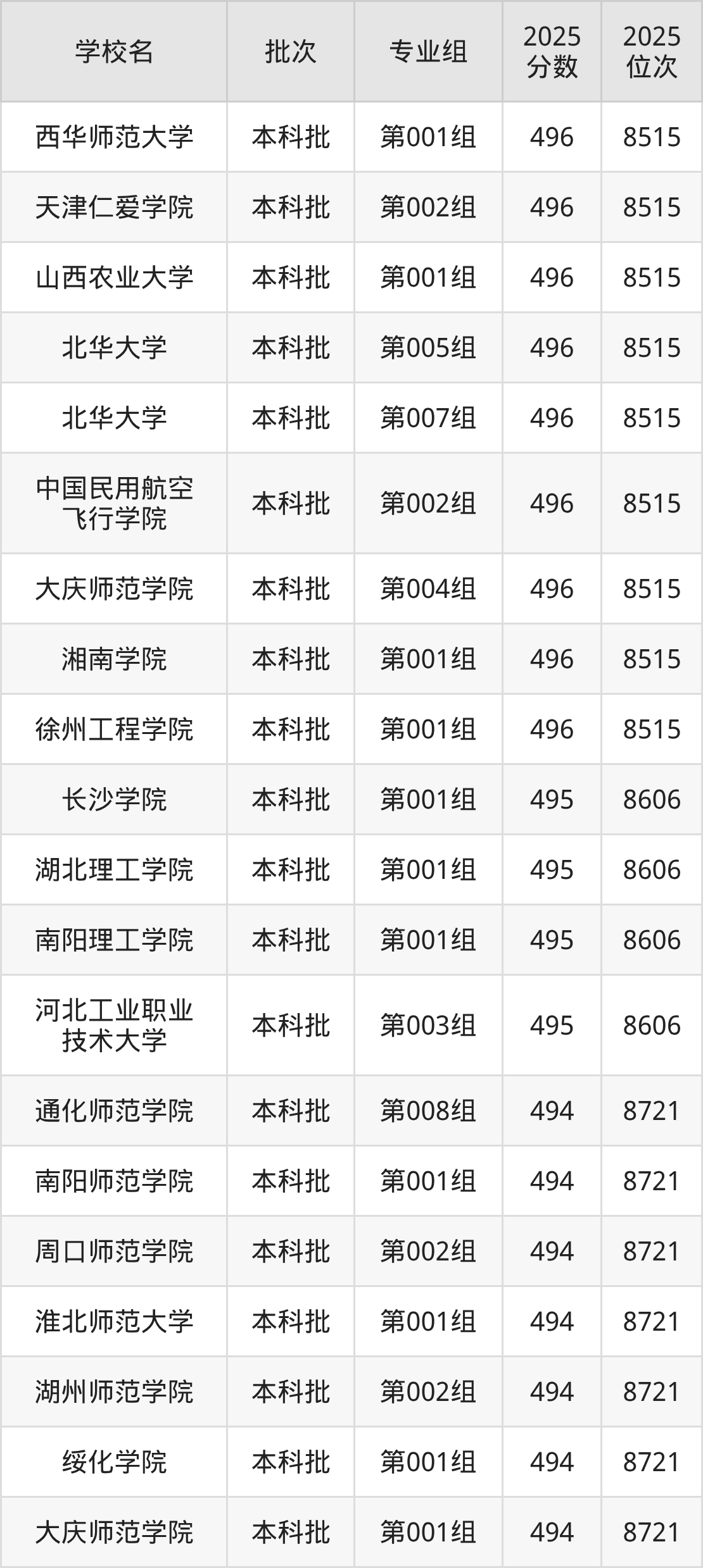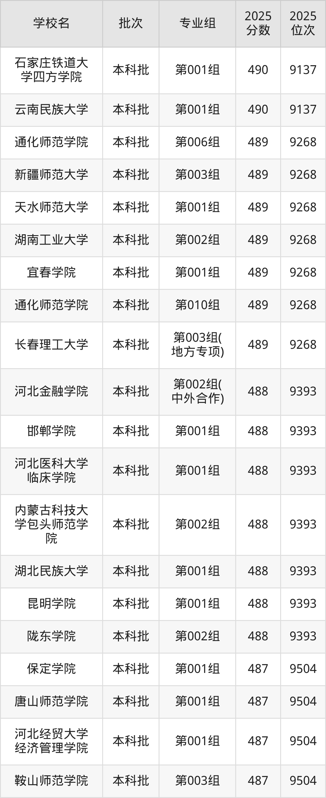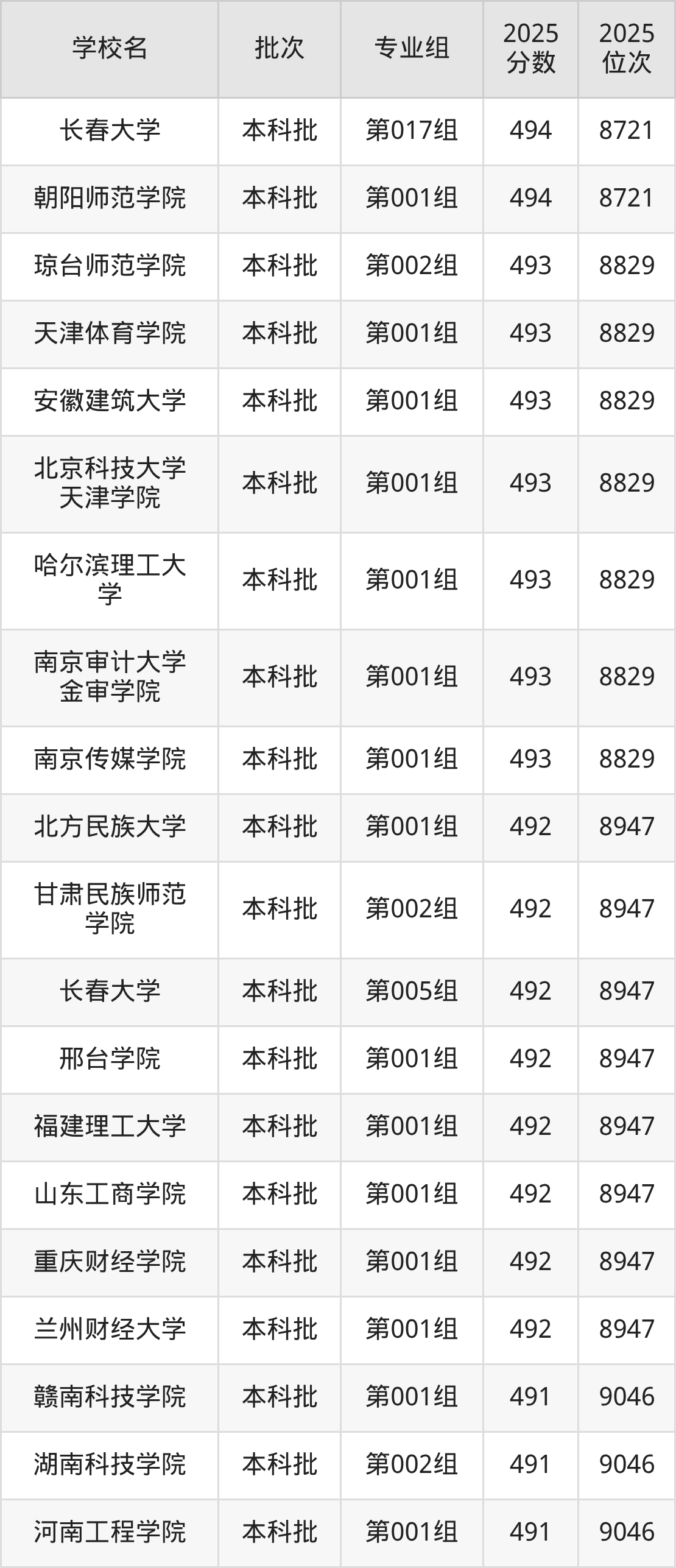 2025年吉林高考历史类491分(8948名~9046名)能上的大学有赣南科技学院第001组、河南工程学院第001组、湖南科技学院第002组。