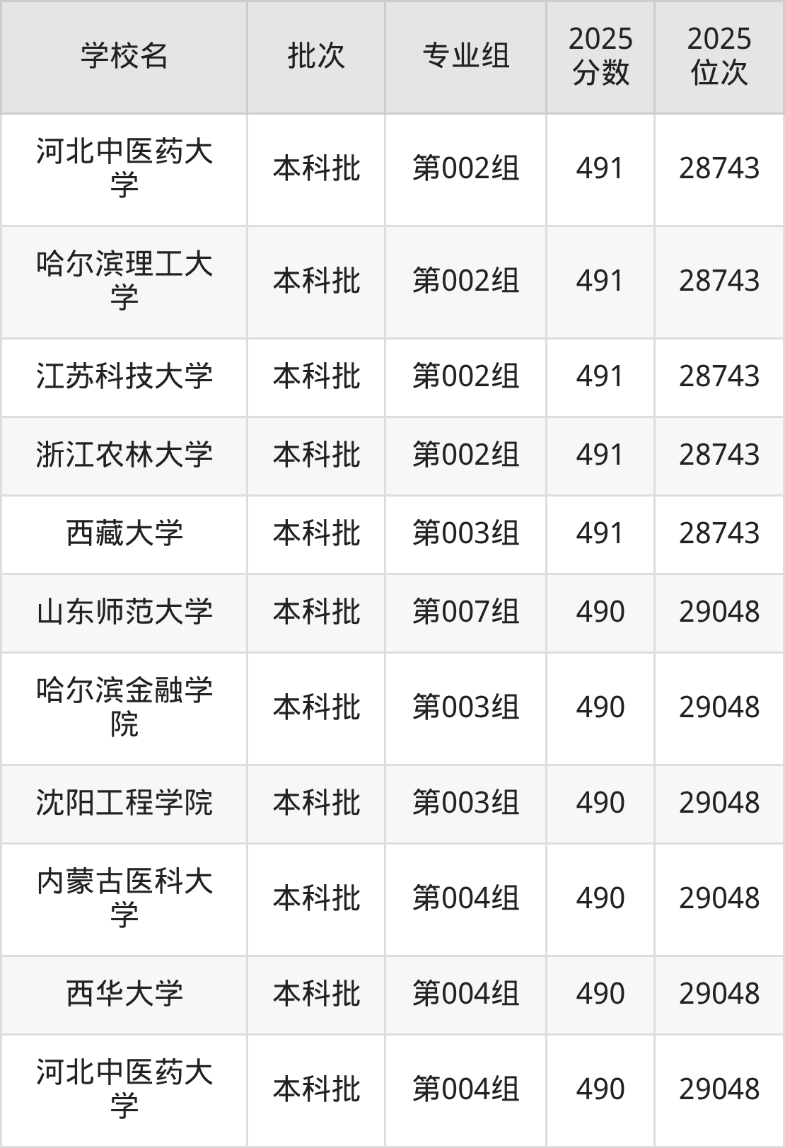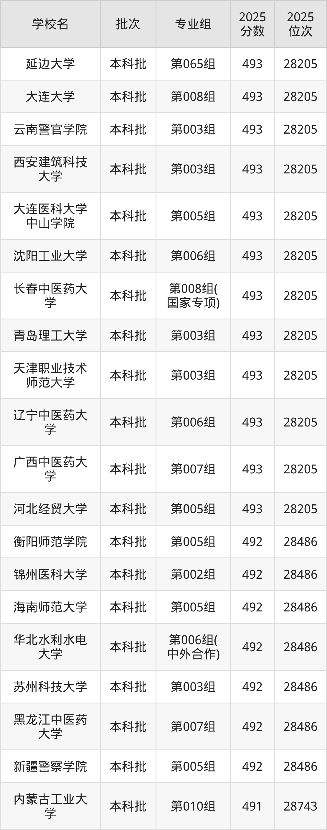 2025年吉林高考物理类491分(28487名~28743名)能上的大学有河北中医药大学第002组、内蒙古工业大学第010组、哈尔滨理工大学第002组、江苏科技大学第002组等。