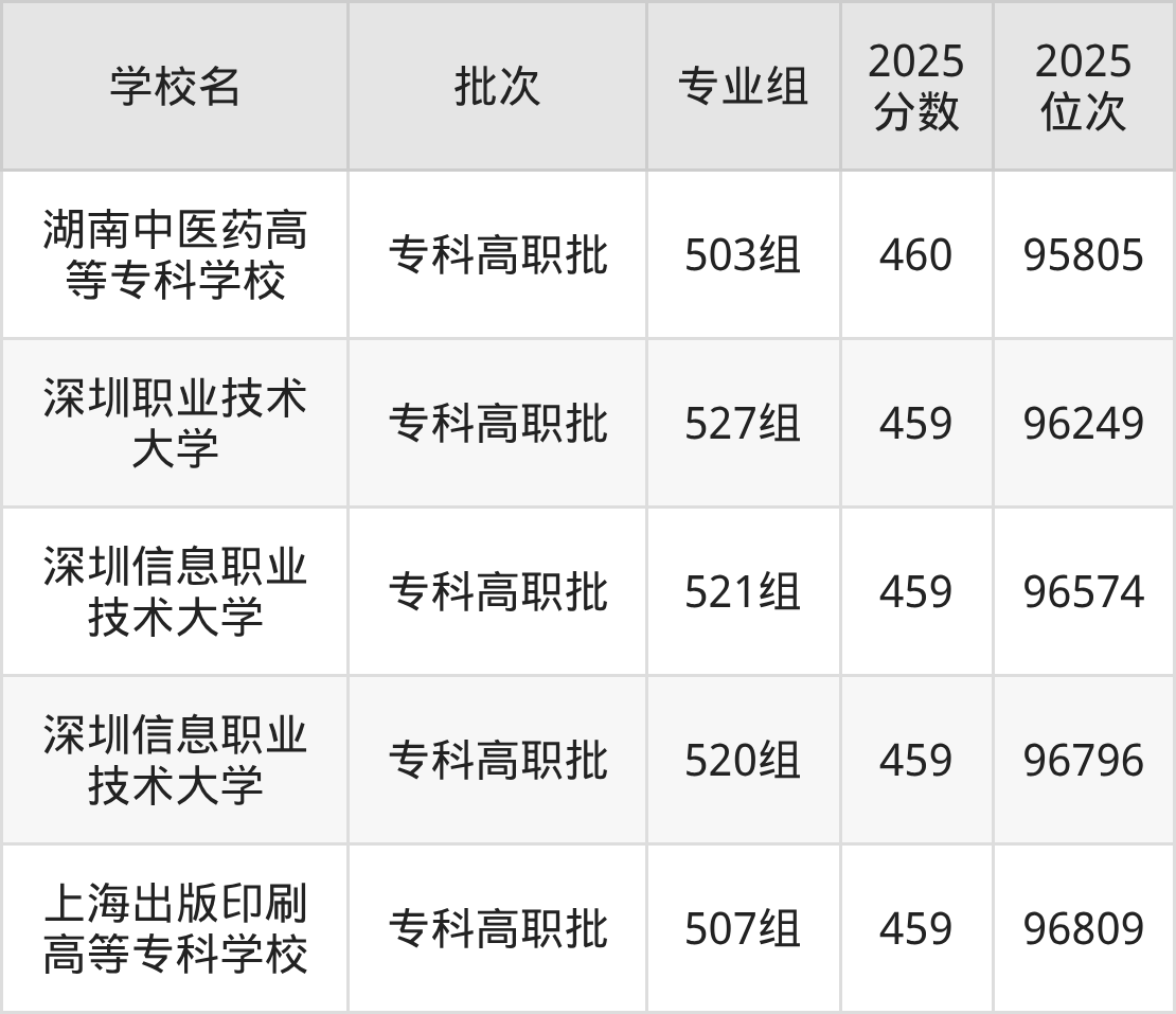 2025年广东高考历史类459分(95859名~96901名)能上的大学有深圳职业技术大学527组、上海出版印刷高等专科学校507组、深圳信息职业技术大学520组、深圳信息职业技术大学521组。