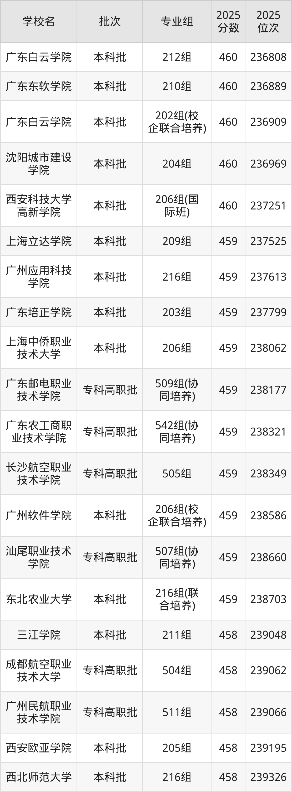 2025年广东高考物理类459分(237279名~238974名)能上的大学有东北农业大学216组(联合培养)、广东培正学院203组、上海立达学院209组、广州软件学院206组(校企联合培养)等。