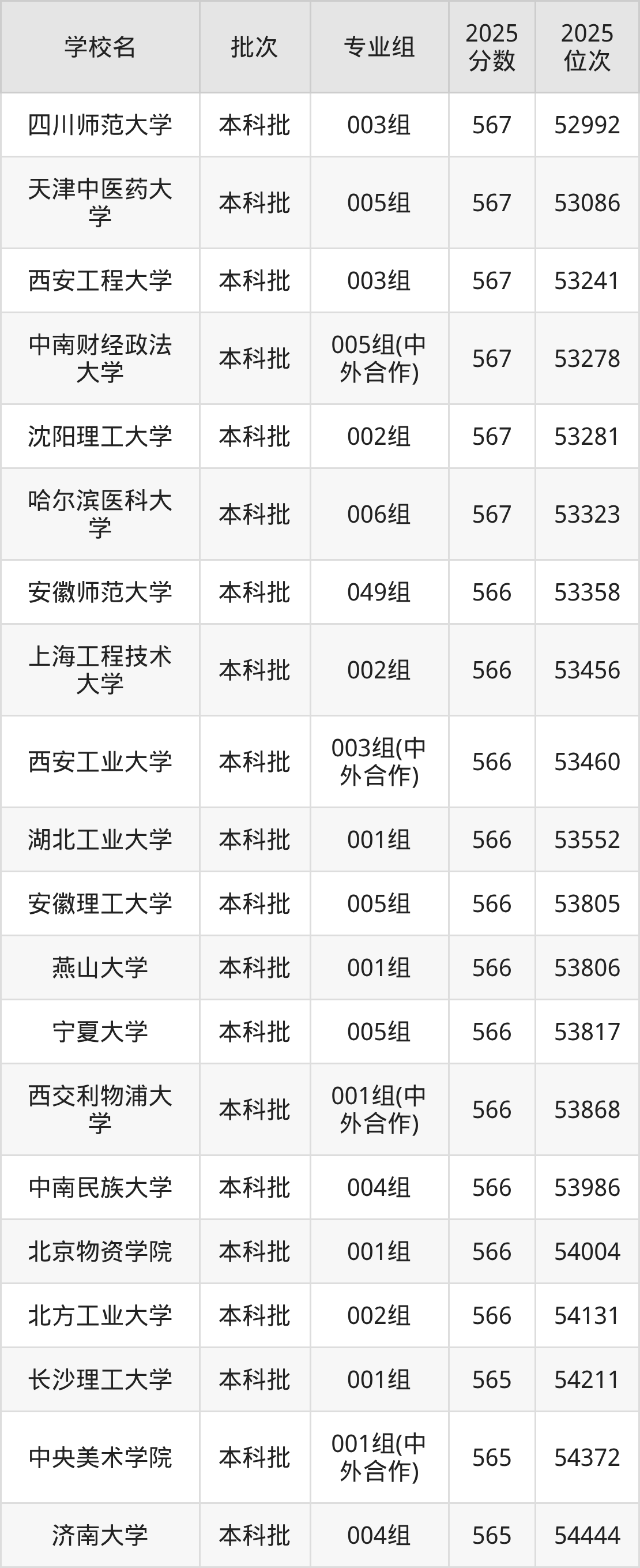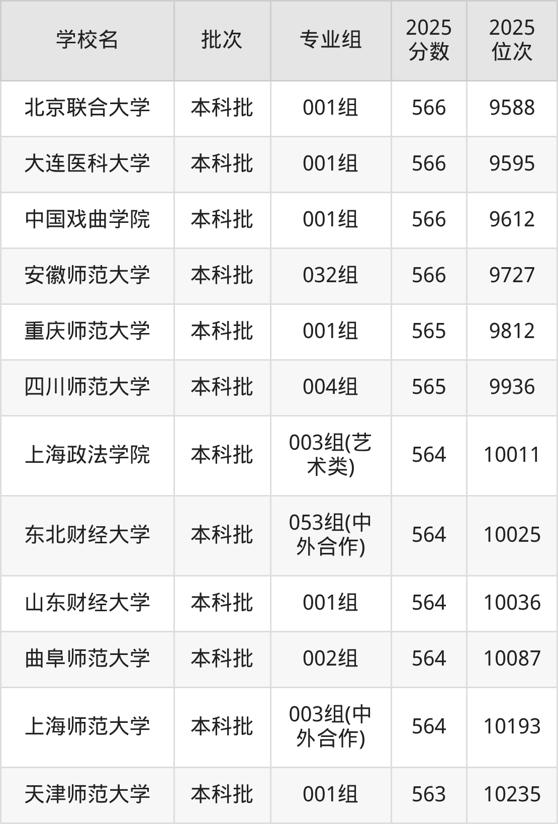 2025年安徽高考历史类566分(9505名~9740名)能上的大学有北京联合大学001组、大连医科大学001组、西南民族大学001组、中国戏曲学院001组等。