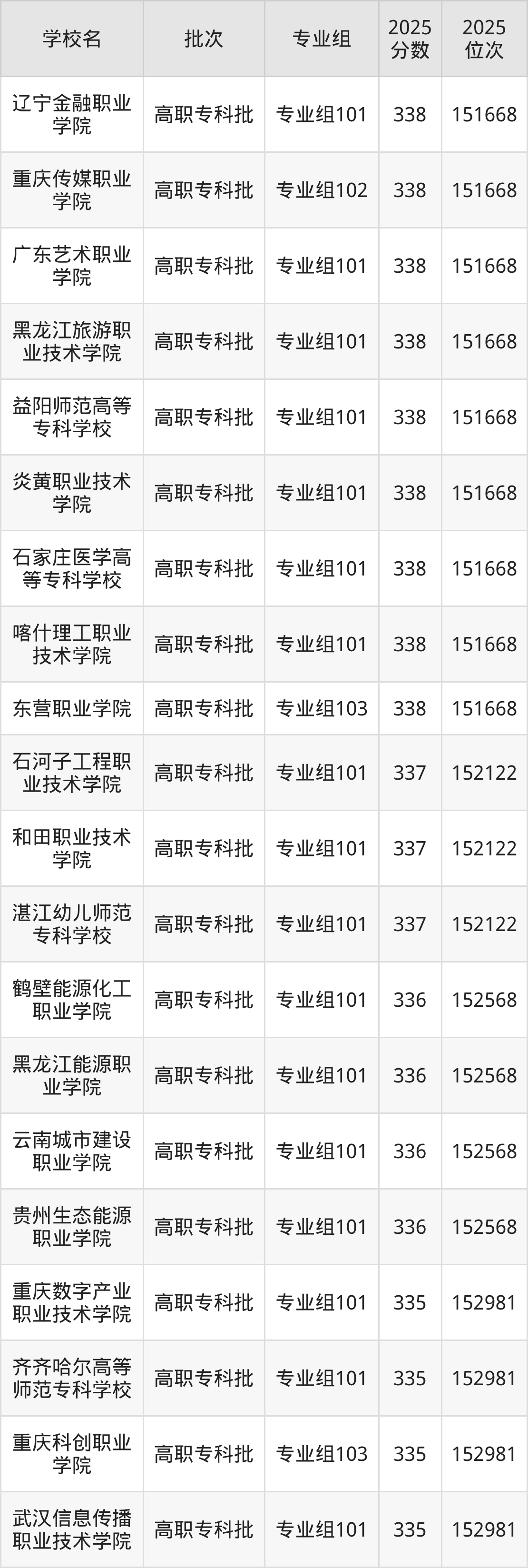 2025年四川高考历史类336分(152123名~152568名)能上的大学有黑龙江能源职业学院专业组101、鹤壁能源化工职业学院专业组101、云南城市建设职业学院专业组101、贵州生态能源职业学院专业组101。