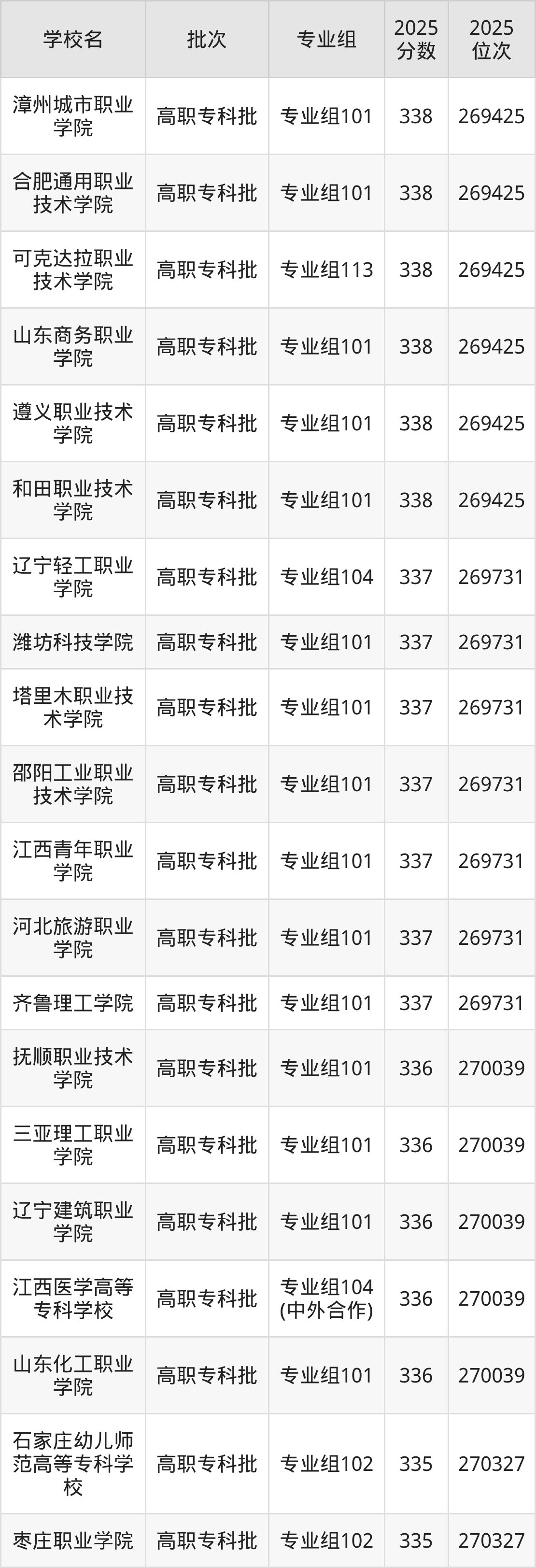 另外录取位次低于该区间(较稳妥)的有石家庄幼儿师范高等专科学校专业组102(270327名)、重庆城市职业学院专业组101(270327名)等;录取位次高于该区间(可冲)的有齐鲁理工学院专业组101(269731名)、河北旅游职业学院专业组101(269731名)等。