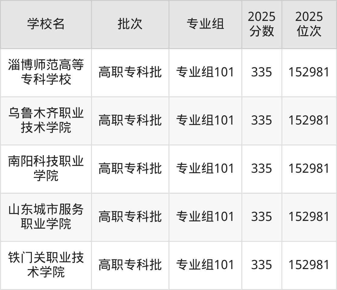 另外录取位次低于该区间(较稳妥)的有铁门关职业技术学院专业组101(152981名)、山东城市服务职业学院专业组101(152981名)等;录取位次高于该区间(可冲)的有湛江幼儿师范专科学校专业组101(152122名)、和田职业技术学院专业组101(152122名)等。