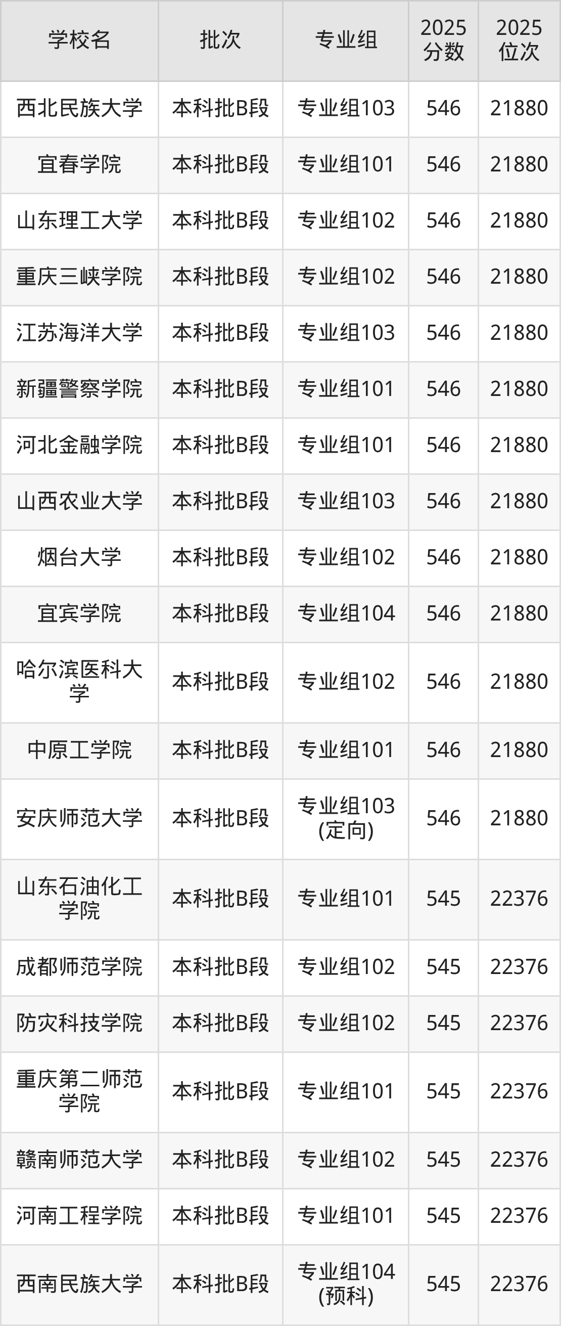 2025年四川高考历史类546分(21413名~21880名)能上的大学有宜宾学院专业组104、湖北经济学院专业组102、安庆师范大学专业组103(定向)、中原工学院专业组101等。