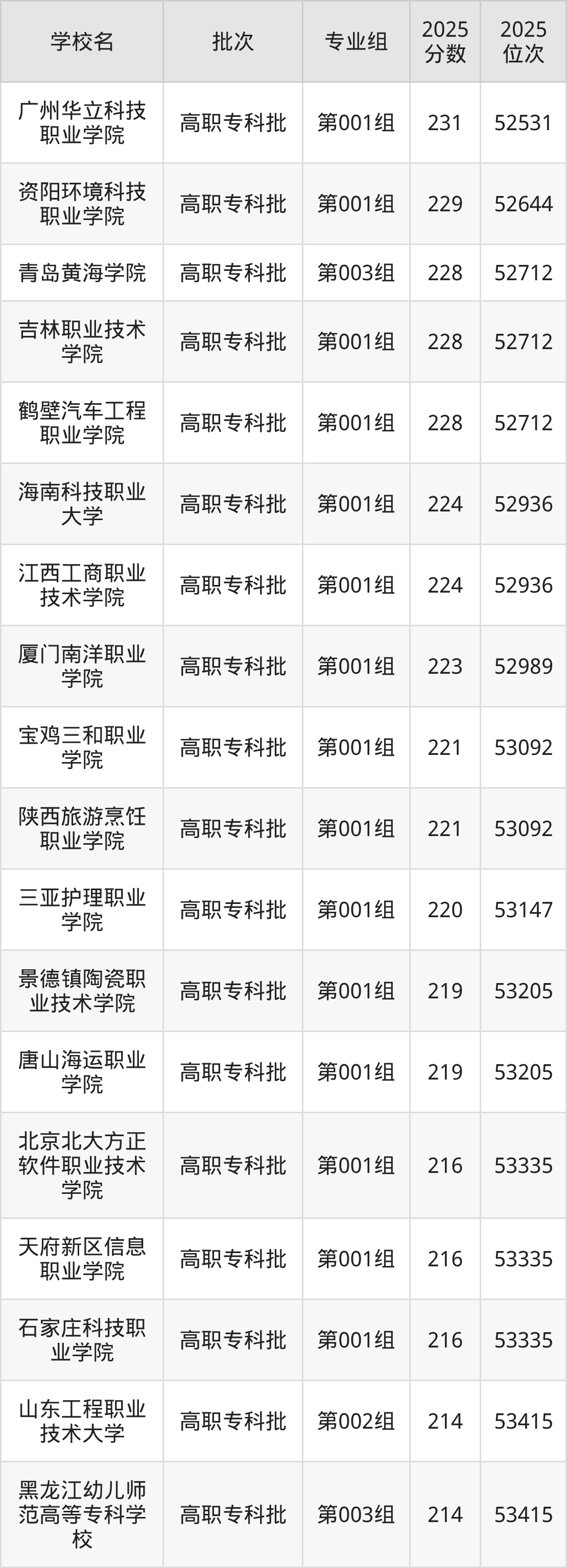 2025年黑龙江高考历史类224分(52882名~52936名)能上的大学有海南科技职业大学第001组、江西工商职业技术学院第001组。
