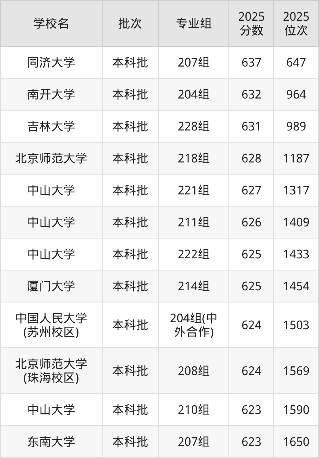 2025年广东高考历史类629分(1108名~1181名)录取位次低于该区间(较稳妥)的有北京师范大学218组(1187名)、中山大学221组(1317名)等;录取位次高于该区间(可冲)的有吉林大学228组(989名)、南开大学204组(964名)等。