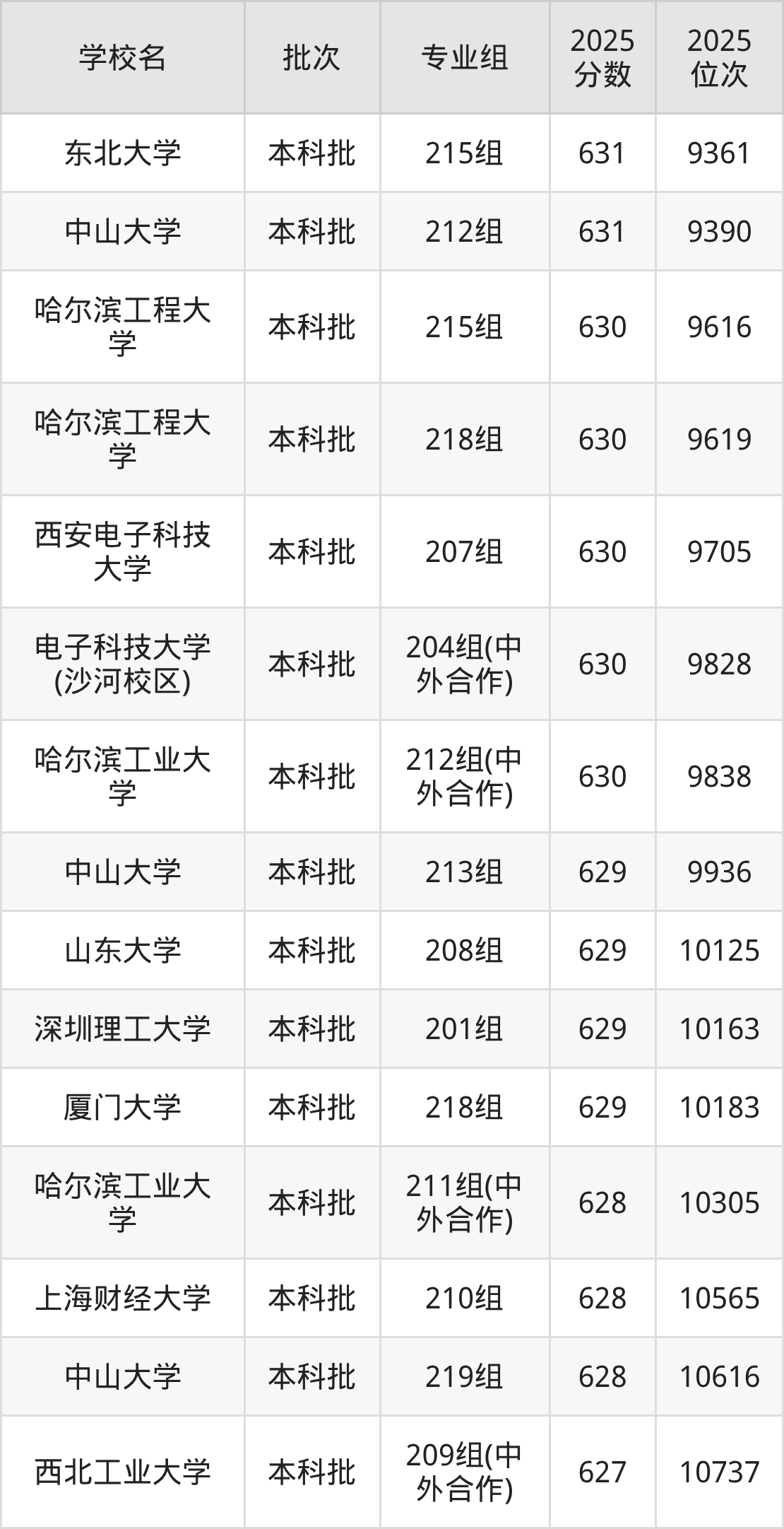 另外录取位次低于该区间(较稳妥)的有哈尔滨工业大学211组(中外合作)(10305名)、上海财经大学210组(10565名)等;录取位次高于该区间(可冲)的有哈尔滨工业大学212组(中外合作)(9838名)、电子科技大学(沙河校区)204组(中外合作)(9828名)等。