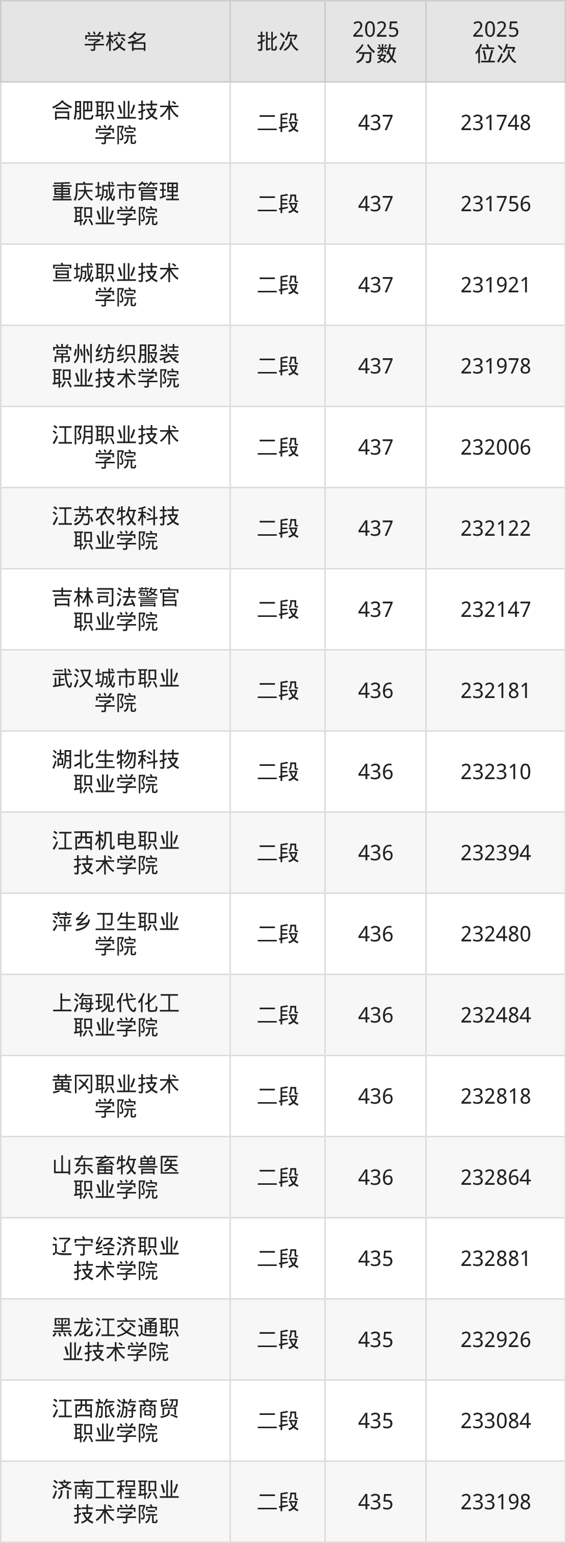 2025年浙江高考436分(232173名~232866名)能上的大学有上海现代化工职业学院、湖北生物科技职业学院、萍乡卫生职业学院、黄冈职业技术学院等。