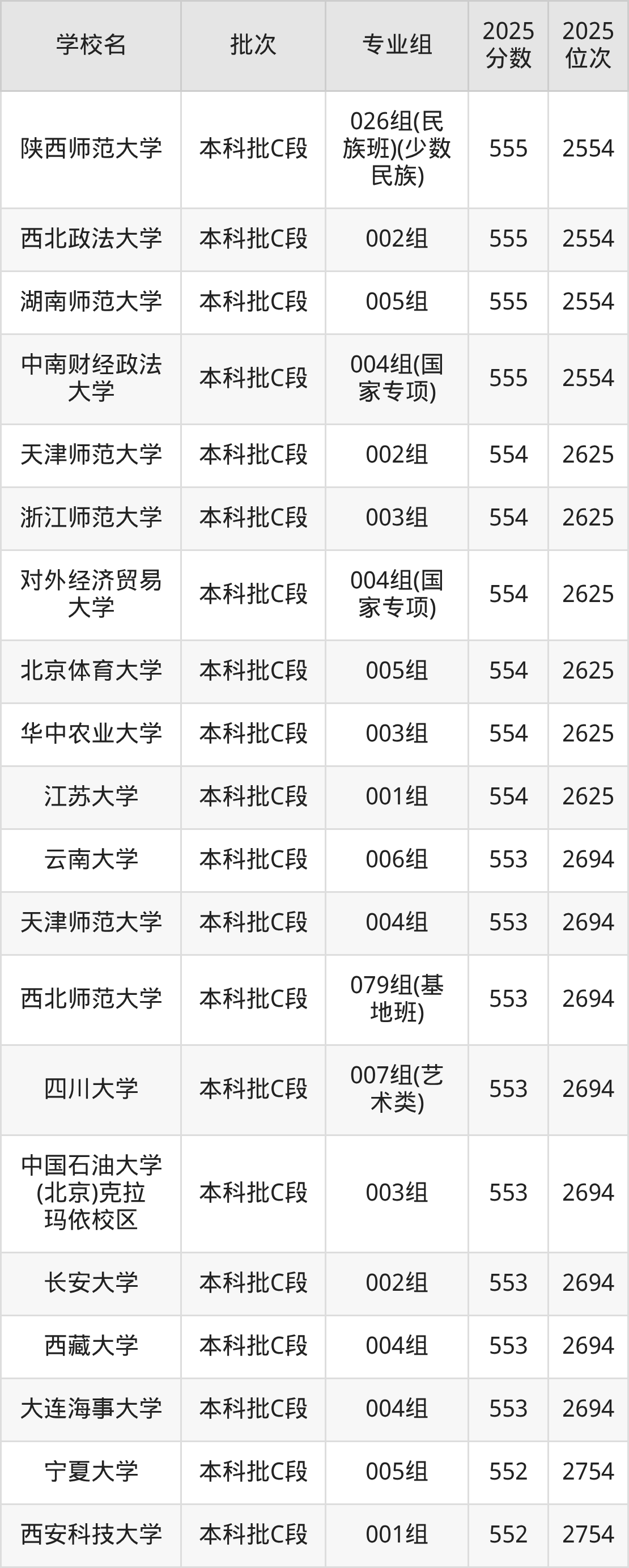 另外录取位次低于该区间(较稳妥)的有西北政法大学002组(2554名)、陕西师范大学026组(民族班)(少数民族)(2554名)等;录取位次高于该区间(可冲)的有江苏师范大学002组(2442名)、东北林业大学003组(2442名)等。